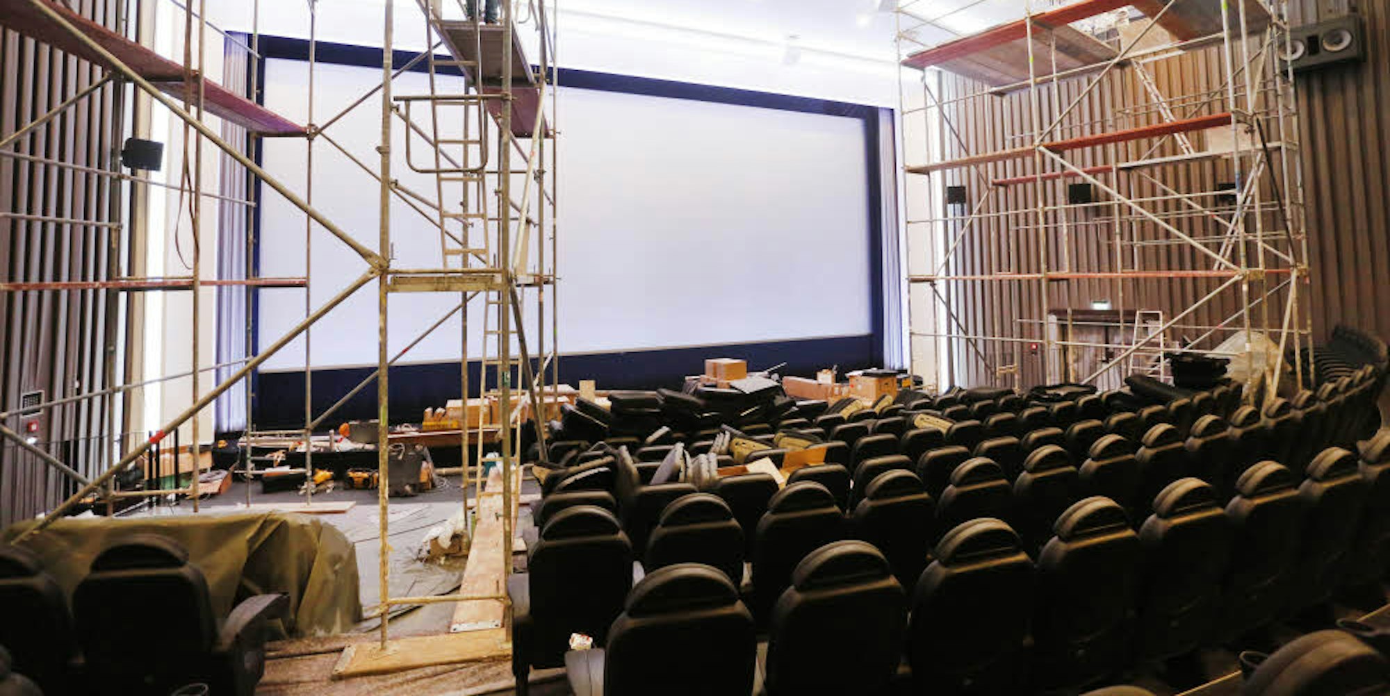 Im großen Saal des Filmpalast mit seiner hohen, geschwungenen Decke montieren Arbeiter noch zwei Kronleuchter.