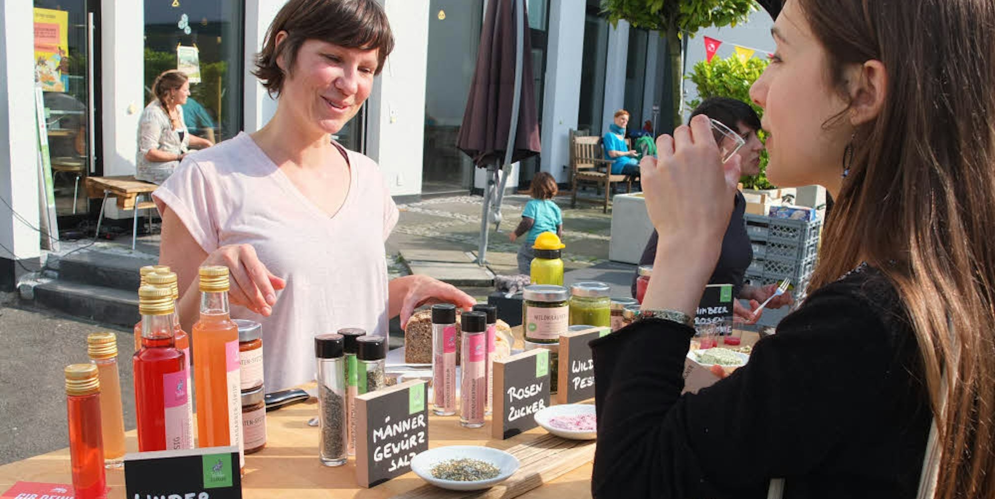 Weinhändler bieten ein Gläschen Prosecco an, kleine Proben von Smoothies und mit Pesto beschmierte Brotstückchen werden gereicht, oder es darf fermentiertes Gemüse gekostet werden.