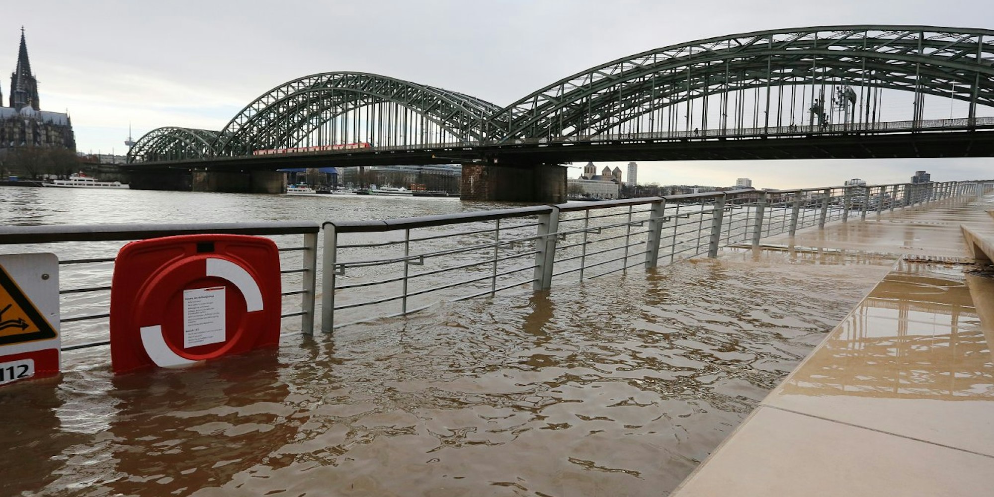 Köln – 5,63 Meter hoch war am Freitag der Kölner Pegel. Das reicht, um die ersten Stufen der Freitreppe des Rheinboulevards in Deutz zu überfluten. Ab einem Pegelstand von etwas mehr als fünf Metern bekommt man auf dem Bauwerk nasse Füße. Deshalb wird es ab diesem Wasserhöhe gesperrt.