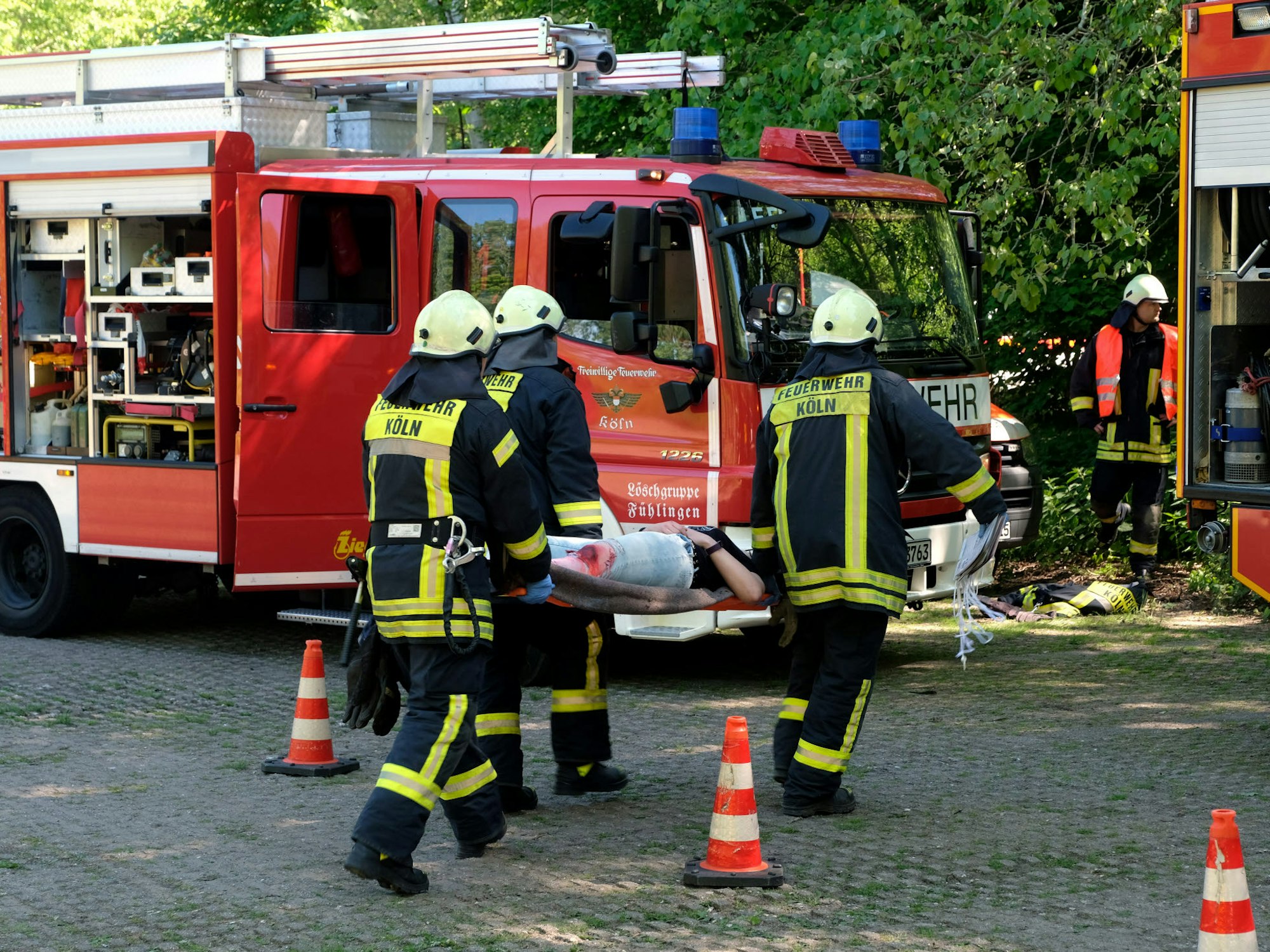 Übungsbeobachter verfolgten den Verlauf der Aktionen, um im Nachgang den einzelnen Mitstreitern ein Feedback geben zu können. „Wir haben dieses Jahr ein großes Spektrum an Einsatz-Szenarien entworfen“, so Organisator Abels. Zu den größten Herausforderungen gehörte ein „schwerer Busunfall“ am Fühlinger See – bei dem die Helfer ganz so agierten, als seien tatsächlich Menschenleben in Gefahr – sowie eine Rettungsaktion in einem „brennenden“ Industriebetrieb. Und am Übungs-Turm der Höhenretter im Hof der Ehrenfelder Wache mussten die Fahrzeugbesatzungen als Team das erste Obergeschoss erklimmen. Bei der „Rettungsaktion“ nach dem Busunfall sei es etwa wichtig gewesen zu entscheiden, welche Betroffenen – je nach Verletzungsgrad – vorrangig behandelt werden müssten, da nicht alle gleichzeitig im Rettungswagen versorgt werden könnten, so Abels. „Ähnlich extreme Fälle kommen in der Realität zum Glück selten vor, aber es ist wichtig, sich darauf vorzubereiten.“