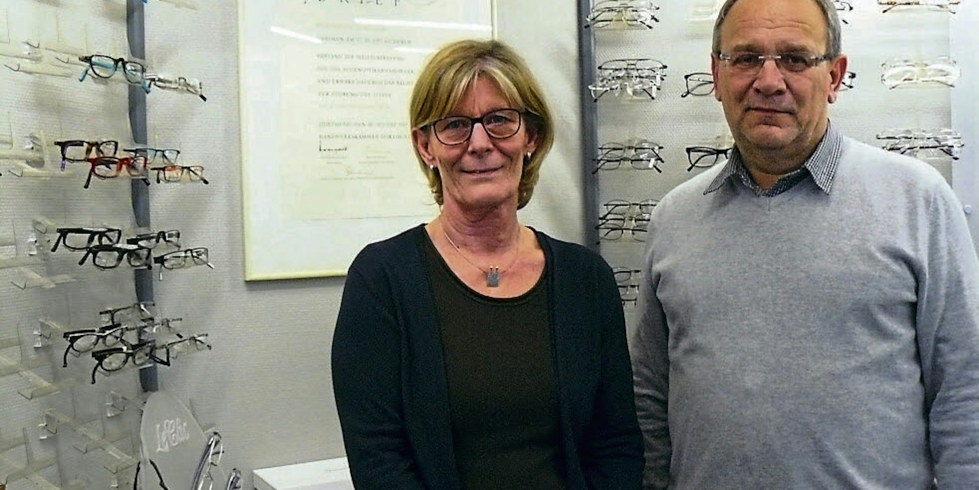 Elisabeth Vehlen und Peter Sauerteig in ihrem Geschäft an der Niehler Straße. Das Refraktionsgerät steht zum Verkauf.