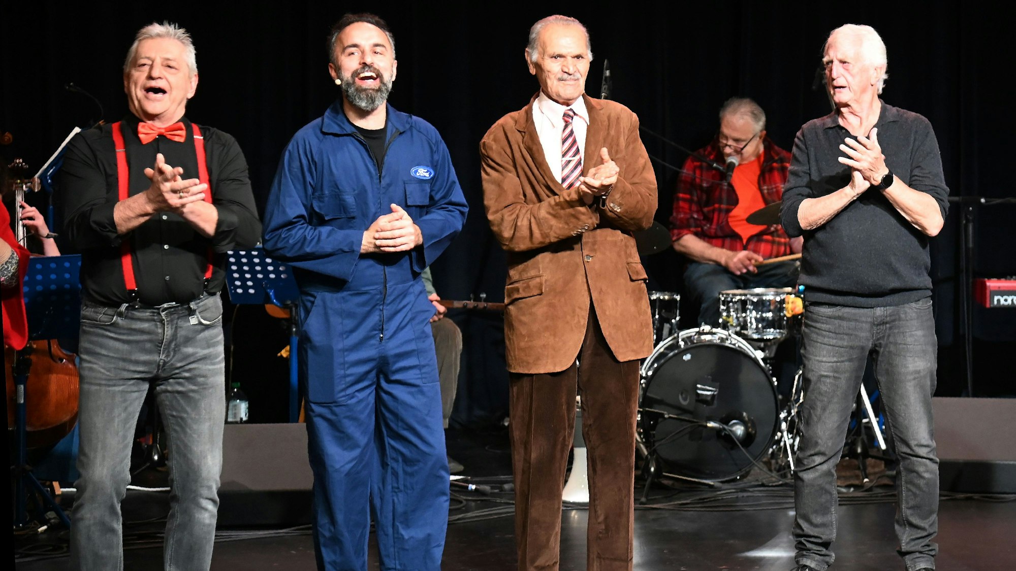 Zeitzeugenerinnerung als Teil der Inszenierung: Peter Bach (r.) und Seyfi Kurt (2.v.r.) berichteten vom Fordstreik. Links: Nedim Hazar und Aydin Isik, im Hintergrund der musikalische Leiter Klaus Mages am Schlagzeug