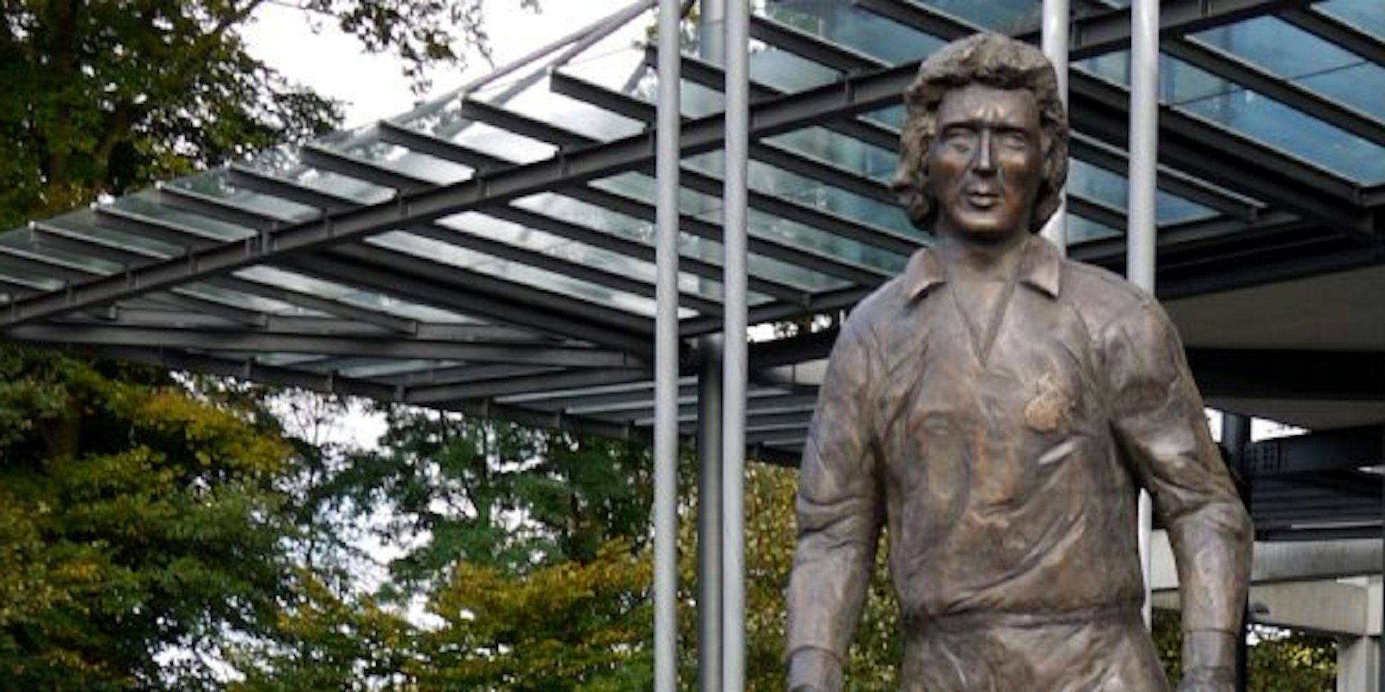 Fußballer-StatueHeinz Flohe dribbelt vor der Südtribüne