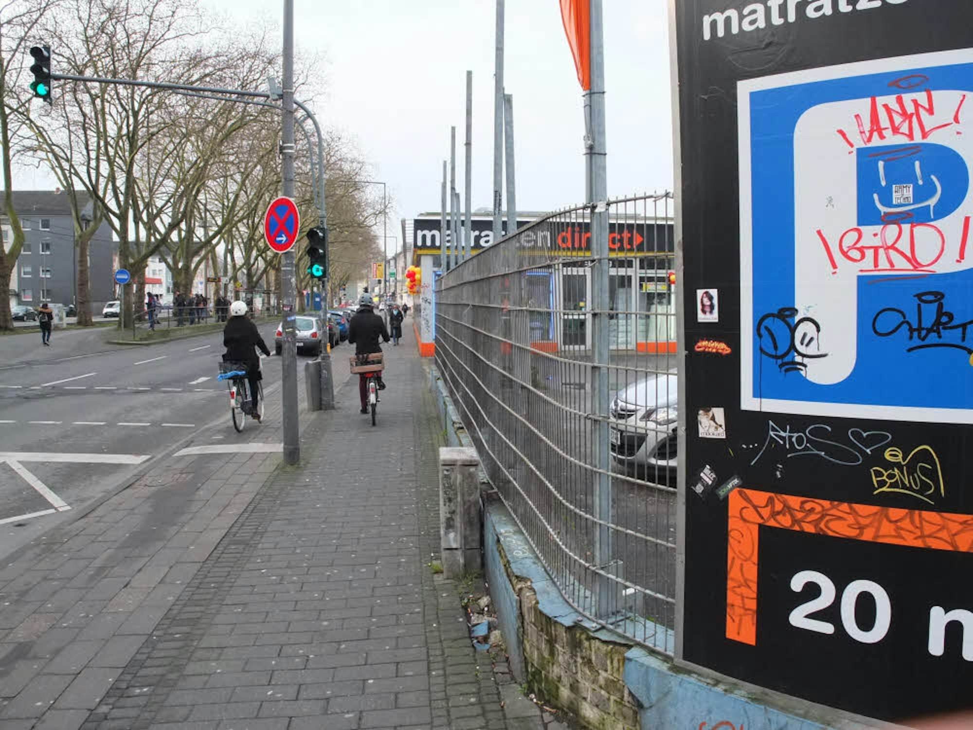 Der Geh- und Radweg am Ehrenfeldgürtel (Bild links) ist schmal. Mehr Grün wollen Bürger an der Rheinlandhalle.