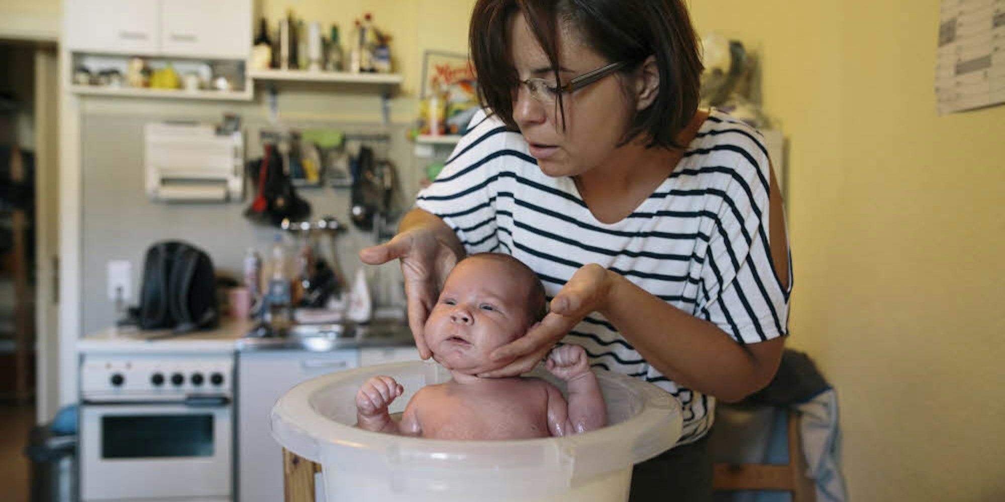 Es ist ihr zwölfter Hausbesuch bei Familie Müller seit der Geburt von deren zweitem Kind. „Wie geht es euch? Wie war der Urlaub?“ Sie stellt Tasche und Eimer ab, eine rasche Umarmung. Ein freundliches Nicken hinüber zu Max, dem Kindsvater. Heute steht Tims erstes Bad auf dem Programm. Solange die Nabelschnur nicht abgeheilt war, ist er mit nassen Tüchern gesäubert worden.