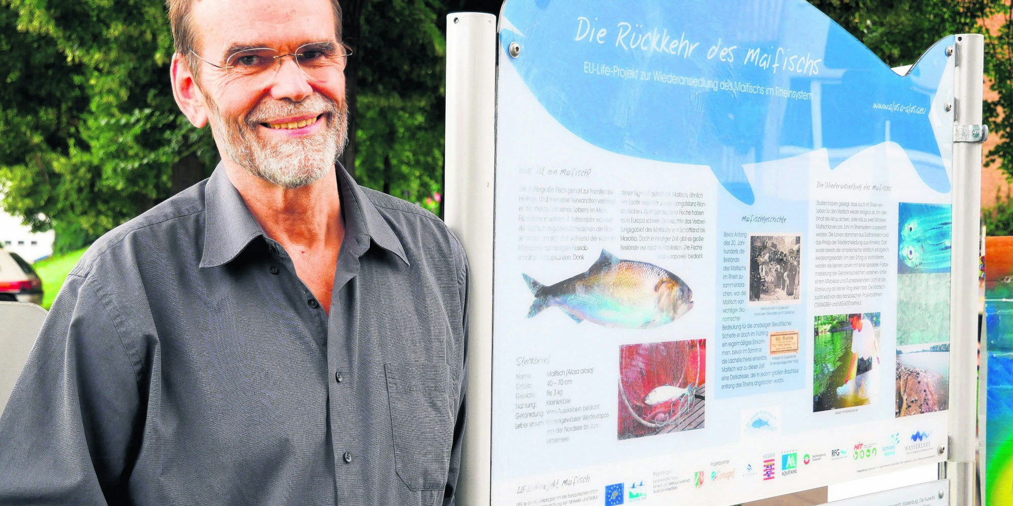 Hans Burgwinkel an der Infotafel über das von ihm mitinitiierte Maifisch-Projekt.