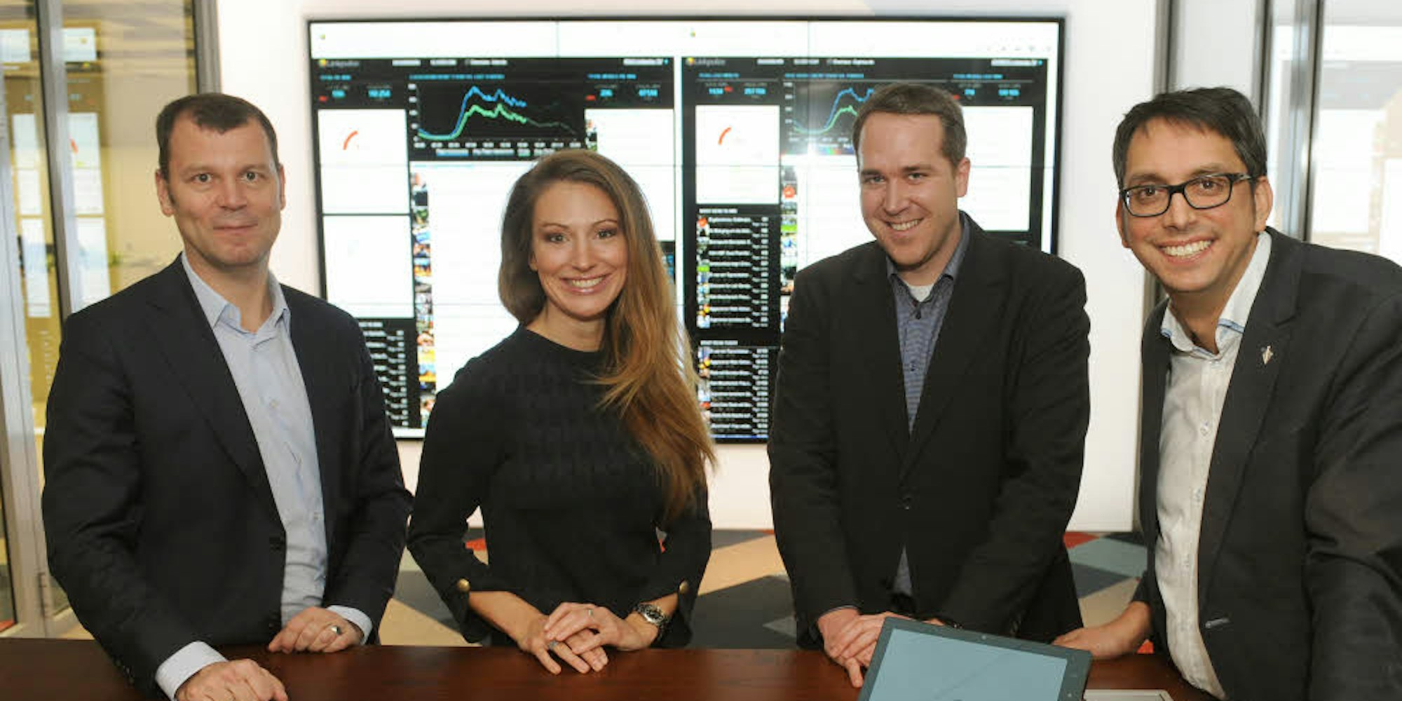 Carsten Fiedler („Kölner Stadt-Anzeiger“), Mara Bergmann (n-tv), Constantin Blaß (EXPRESS) und Thomas Kemmerer (General Manager Digital) vor der Medienwand des neuen Newsrooms.