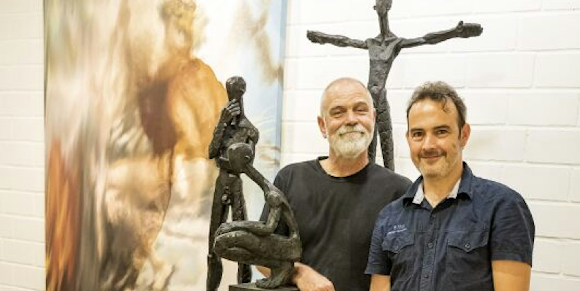 „Ich bin sehr froh mit dieser Ausstellung. Meine Skulpturen passen wunderbar zu den Bildern von Jorge Pombo“, sagte der Kölner Bildhauer Hannes Helmke. Der spanische Maler, der in Italien lebt, hat sich bei seinen Bildern von den Motiven Michelangelos in der Sixtinischen Kapelle in Rom inspirieren lassen.