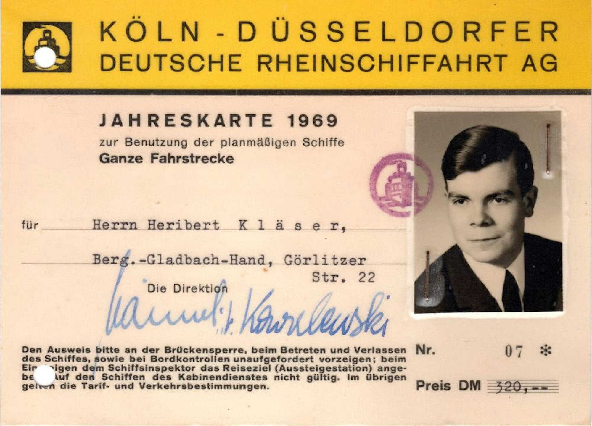 1969 fiel dem Schiffsbeobachter Kläser etwas auf, was seinem Hobby neuen Schwung verlieh. „Ich stellte fest, dass unter den Passagieren einige waren, die offenbar regelmäßig und häufig mitfuhren. Auf meine neugierige Nachfrage hin erfuhr ich, dass sie eine KD-Jahreskarte besaßen und daher nach Lust und Laune an Bord gehen konnten. So oft sie wollten.“ Das klang in den Ohren von Kläser wie Musik. Sogleich erkundigte er sich nach den Modalitäten für den Kauf der Karte. Und war zunächst ernüchtert. 320 D-Mark kostete das begehrte Stück. Zu viel für den Bankkaufmann, der gerade seine Lehre beendet hatte und 120 D-Mark Monatsgehalt nach Hause trug.