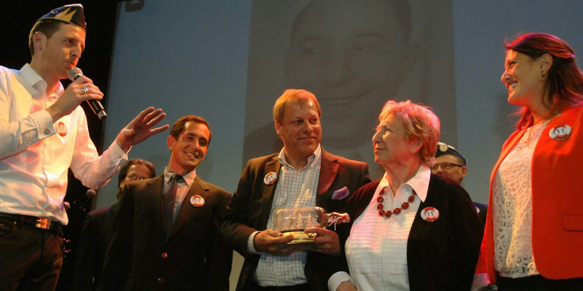Als ersten Preisträger hatte die Stattgarde Markus Ritterbach ausgewählt. Der Festkomitee-Präsident habe sich, so Schulze Isfort, „besonders für Toleranz und Integration im Kölschen Fasteleer verdient gemacht und auch die öffentliche Aufarbeitung der nationalsozialistischen Vergangenheit im Kölner Karneval mit initiiert“. Zur Preisverleihung hatte die Stattgarde Tobars Tochter Lilo Cordaro (88) ausfindig gemacht und mit ihren beiden Enkeln Julia Ho (29) und David Ho (27) aus New York einfliegen lassen. Die alte Dame, die als Kind oftmals auf dem Schoß von Willi Ostermann gesessen hatte, mit dem die Familie befreundet war, hatte sich Stunden zuvor noch bei einem Empfang im Rathaus bei Bürgermeisterin Elfi Scho-Antwerpes ins Gästebuch der Stadt eingetragen. Nun dankte sie mit charmantem Lächeln für den „netten und reizenden Empfang“. Ritterbach lud ihre Enkel für den kommenden Rosenmontagszug auf seinen Festwagen ein und – nach kurzer Absprache mit Zugleiter Christoph Kuckelkorn – auch die gesamte Stattgarde in den Zoch. Diese zähle schließlich inzwischen mit zu den größten Karnevalsgesellschaften der Stadt, stellte Ritterbach fest und bescheinigte ihr „ein gigantisches Niveau“. Ritterbach: „Der Karneval schließt keinen aus. Es ist egal, wie man lebt und wen oder wie man liebt.“ Es war ein fest voller bewegender Momente und ein ganz großer Abend für die Stattgarde. (NR)