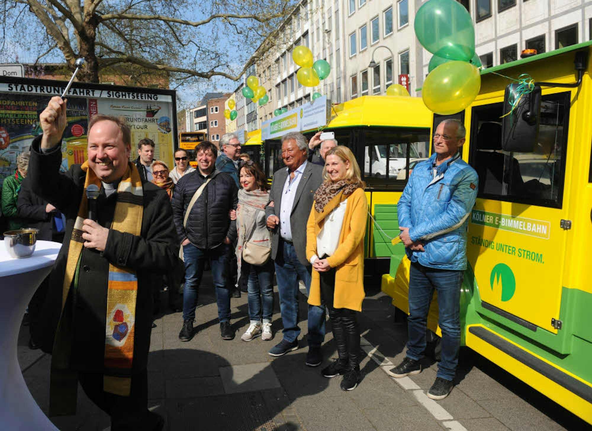 Gut geschützt ist das Gefährt aber bereits: Vor der ersten, sehr kurzen Jungfernfahrt am Mittwoch segnete Stadtdechant Monsignore Robert Kleine die E-Bimmelbahn.