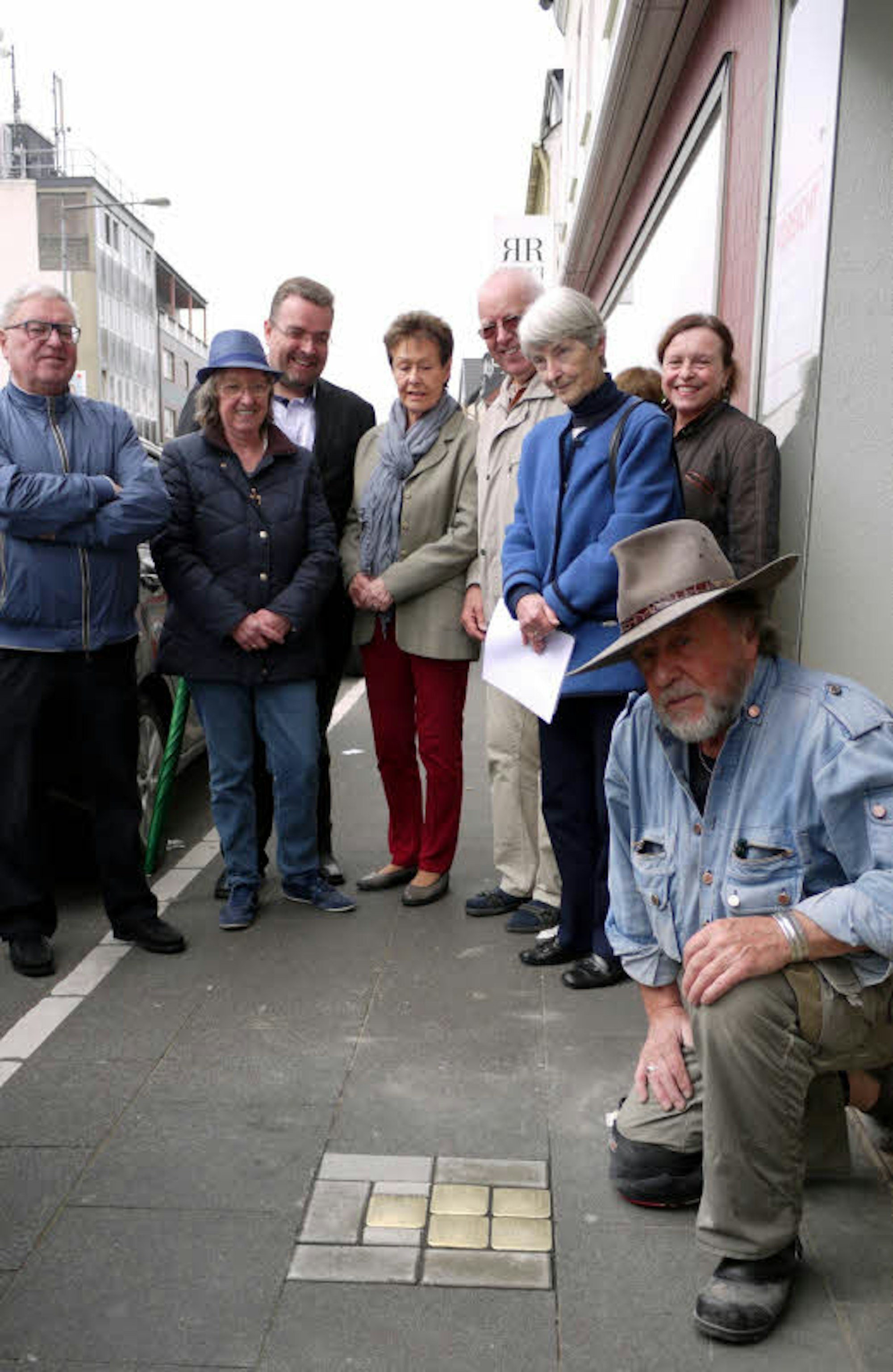 Künstler Günter Demnig (r.) mit Liselotte Berschel (3.v.r) und Vertretern der Sponsoren