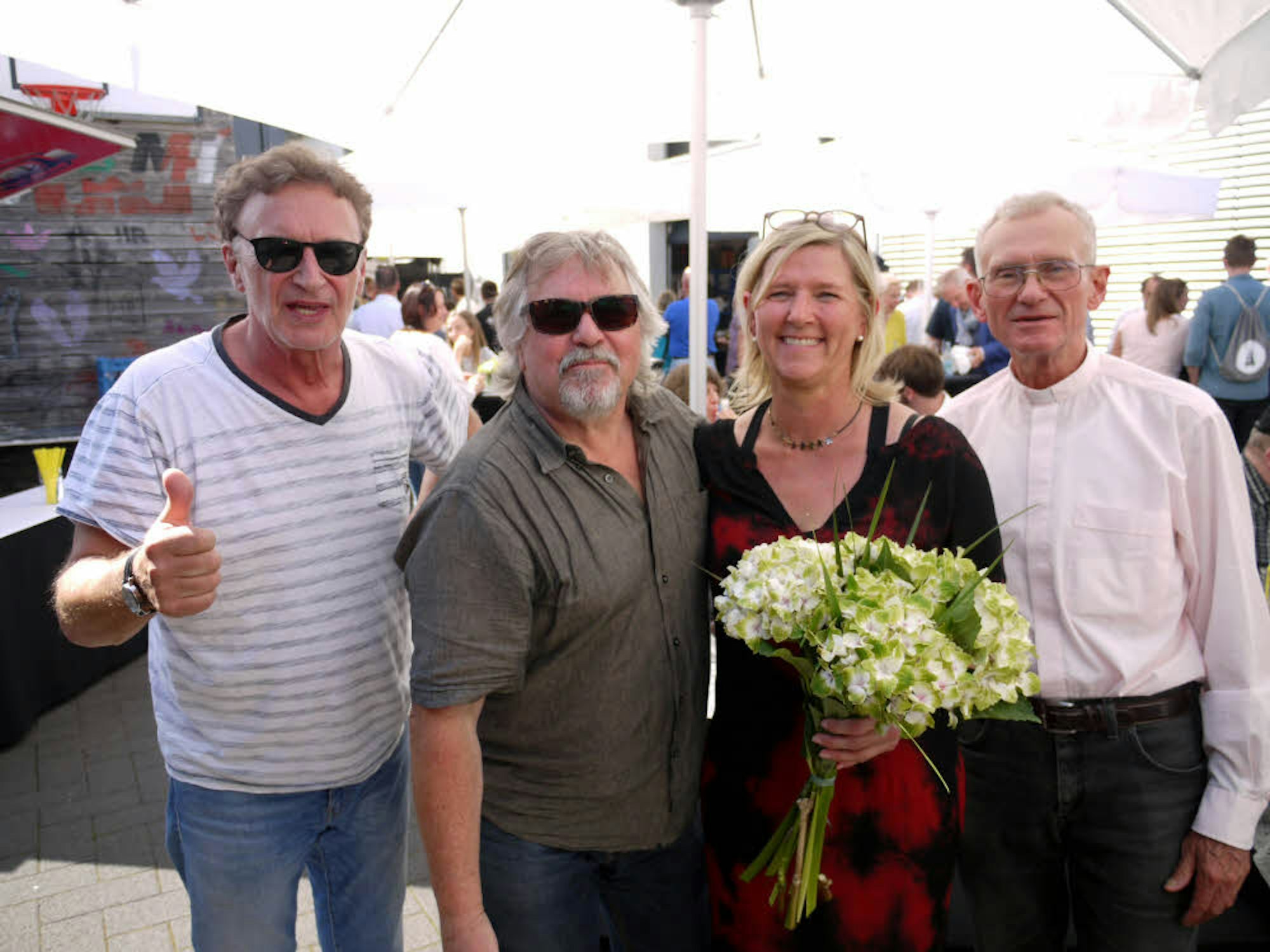 Chefin Dagmar Rohde mit Reiner Hömig (v.l.), Tommy Engel und Pastor Franz Meurer