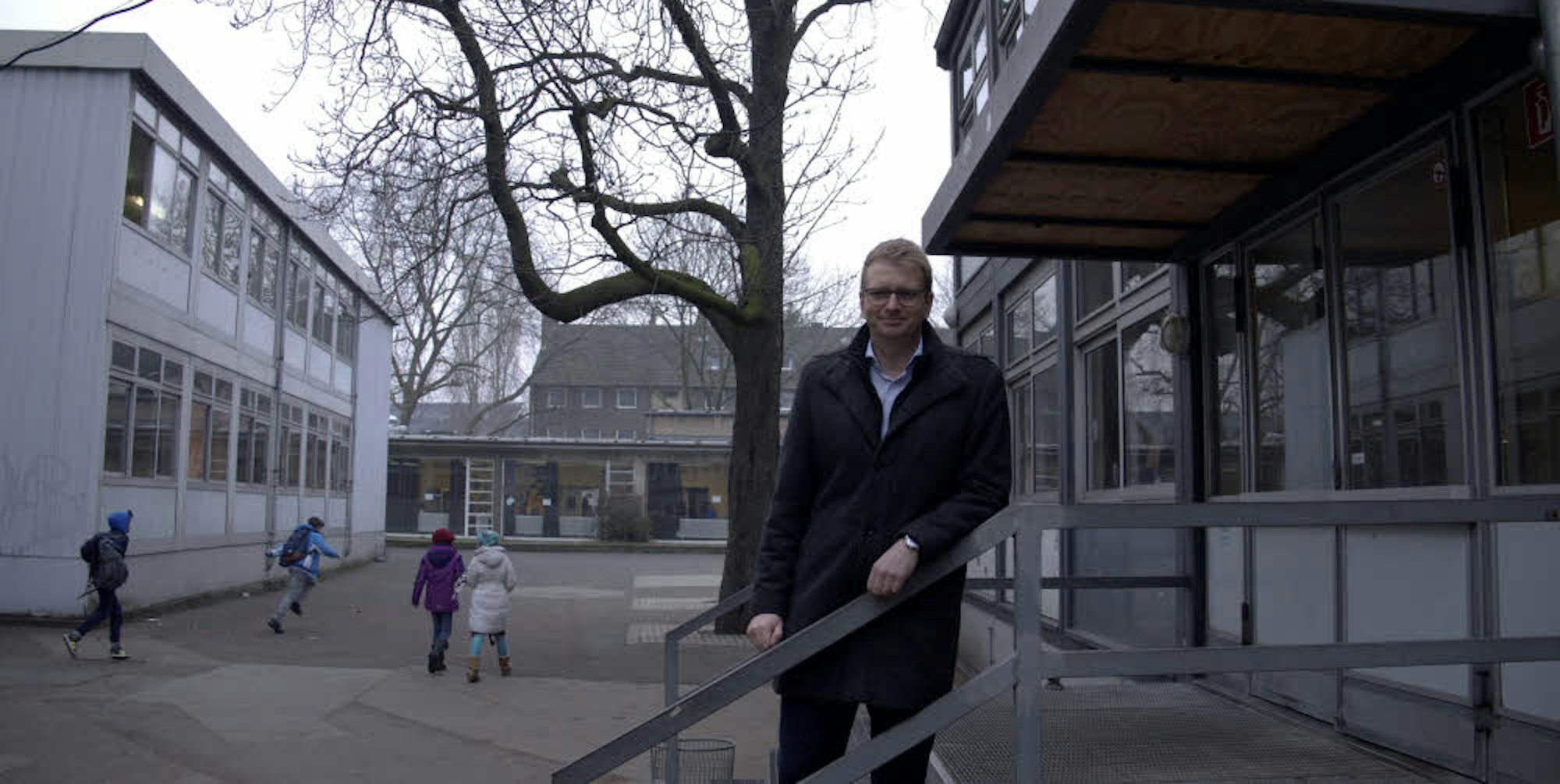 Schulleiter Oliver Schmitz an den Lern-Pavillons, die Anfang der 70er Jahre als verübergehendes Provisorium aufgestellt wurden.