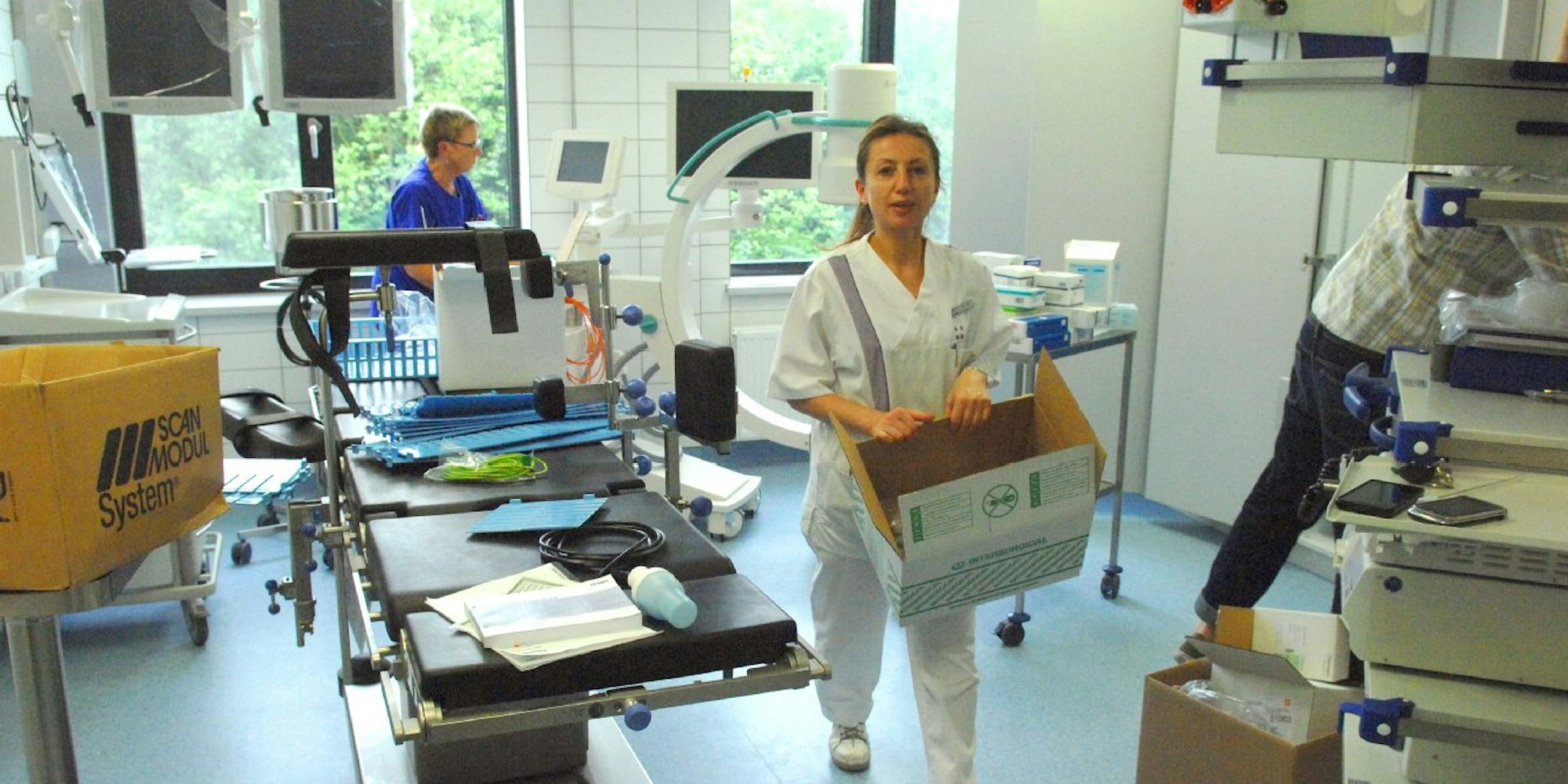 In den Räumen der Bronchoskopie der Lungenklinik werden neue Geräte samt Material ausgepackt.