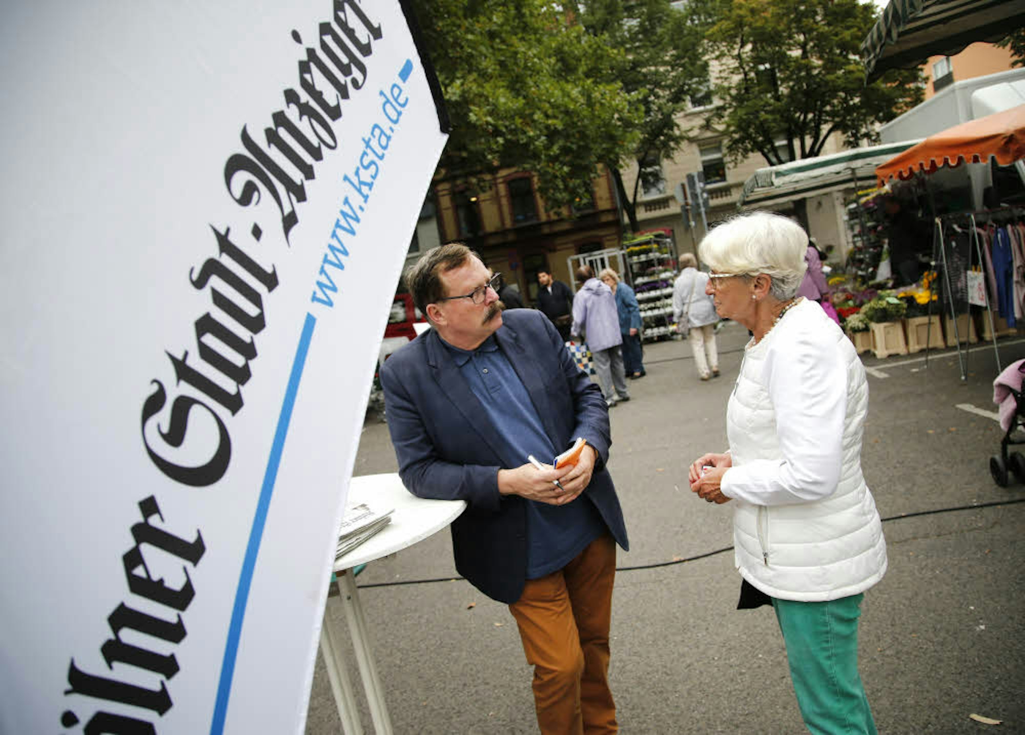 Der Wochenmarkt hier ist klein, vielleicht zehn Stände. Die Sorgen sind groß. Anziehsachen, Lebensmittel, Parteiwerbung. Mehr nicht. Aber man ist froh, dass der Markt da ist. „Auch das ist hier ein Problem“, sagt Doris Broich, „außer dem Markt fehlen hier mittlerweile einfach die Angebote.“ Seit 1962 wohnt sie hier, ist in das Veedel „reingeheiratet“, wie sie sagt. Früher, da hätte es noch mehr Supermärkte gegeben. Mittlerweile ist außer dem „Lidl“ an der Pulvermühle alles weg. „Auch Ärzte sind nicht genug da“, sagt Broich. Ein männlicher Passant pflichtet ihr bei.