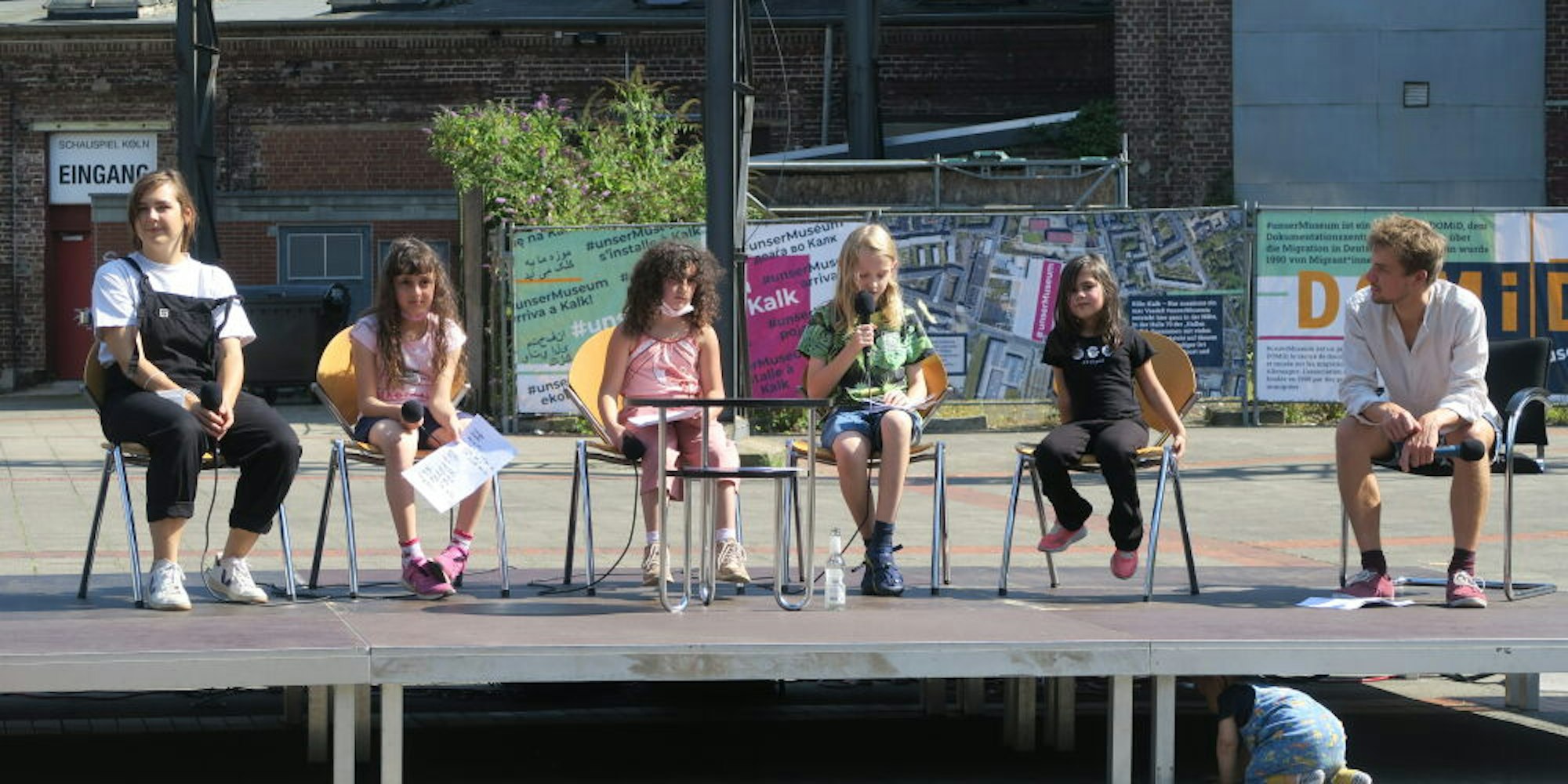Immerhin vier der sieben jungen Teilnehmer haben sich auf das Podium gewagt, um die Ergebnisse am zweiten Tag des Festivals rund 40 Besuchern auf dem Ottmar-Pohl-Platz vorzustellen. „Wir haben mit den Kindern über ihren Alltag, ihre Sorgen und Wünsche gesprochen“, erklärt Comic-Künstlerin Jacquie Mundri. Dabei ging es nicht immer superernst zu, wie schon die Überschrift der Präsentation verrät: „Warum es okay ist, ein Toastbrot als Kopf zu haben“.