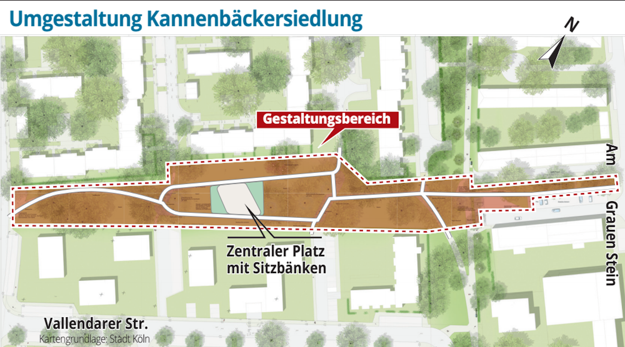 So soll etwa ein völlig neu gestalteter Quartiersplatz in zentraler Lage künftig Veedelsbewohner und Passanten zum Verweilen einladen. Die Wegverbindungen der Grünfläche „Kannebäckersiedlung“ werden neu geordnet.