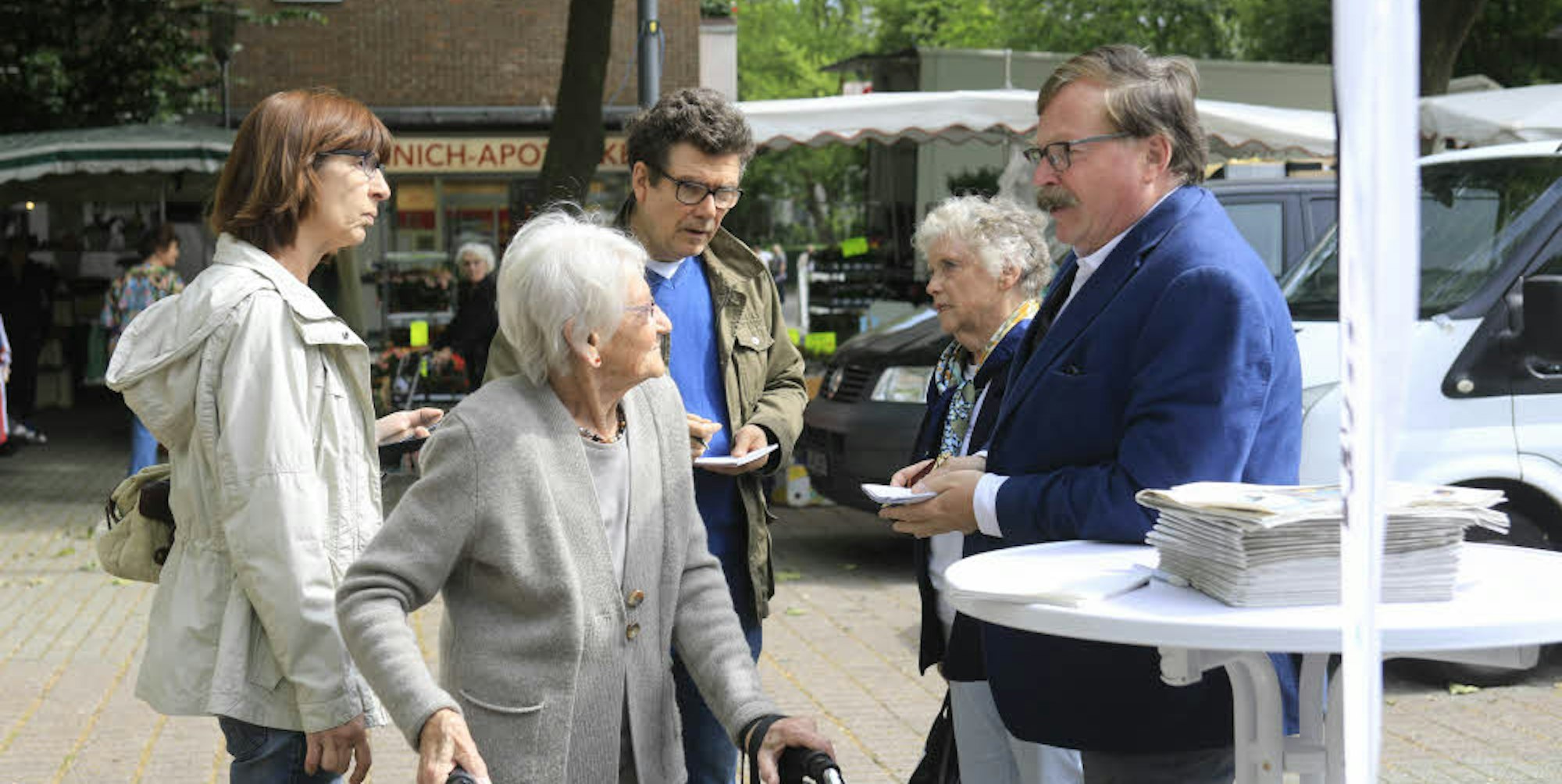 Bürger aus Neubrück sprechen mit Norbert Ramme (r.) und Peter Limbach (M.) über positive und negative Seiten ihres Veedels.