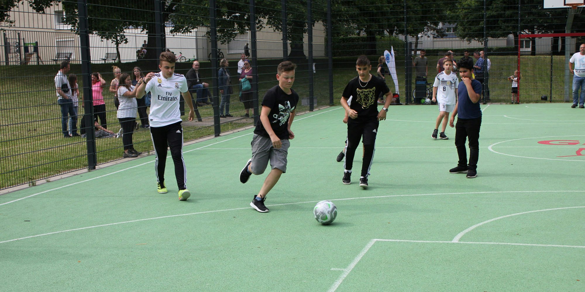 Auf dem Bolzplatz an der Gronauer Straße bieten KIDsmiling und GAG professionelles Fußballtraining für Kinder und Jugendliche aus der Nachbarschaft.