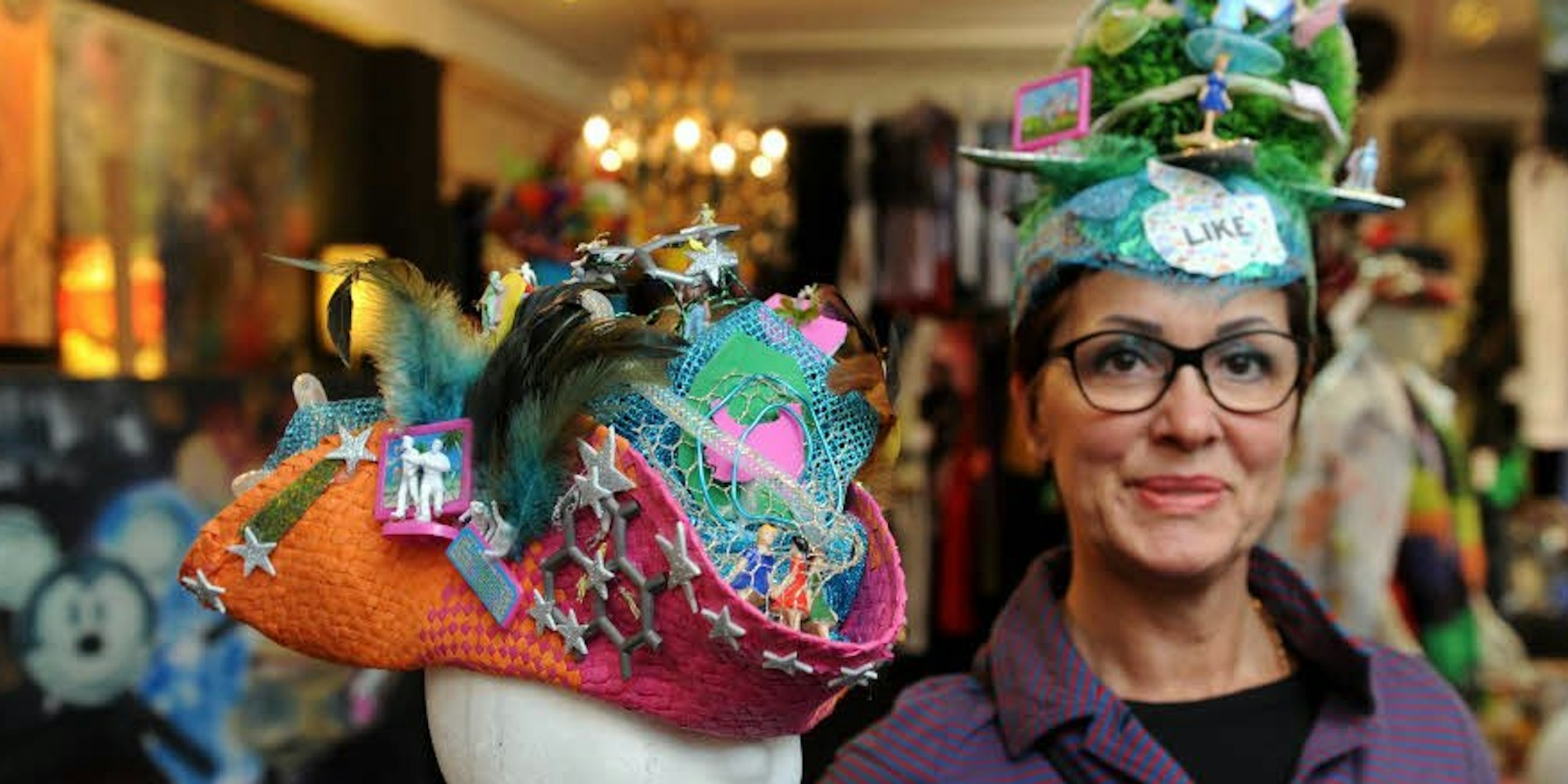 Ebenfalls opulent, dabei jedoch etwas traditionsgemäßer sind die Kopfbedeckungen bei „Jeck mit Stil“. In dem nur bis Rosenmontag betriebenen Ladenlokal , das sonst Lager eines Sanitätshauses ist, verkauft Beate Wilms selbst kreierte Hüte , Haarreifen und Fascinator zusammen mit Frack-Oberteilen, die allesamt ein Clownsgesicht auf dem Rücken haben. handgefertigte Karnevalshüte sind auch eine Spezialität von Monika Nitschke in ihrem Geschäft Hoot Couture. Dort findet man ferner Jacken, Blazer und Fräck, die von der Künstlerin Irene Herkenrath mit Kölschen Originalen oder Kölner Motiven bemalt wurden.
