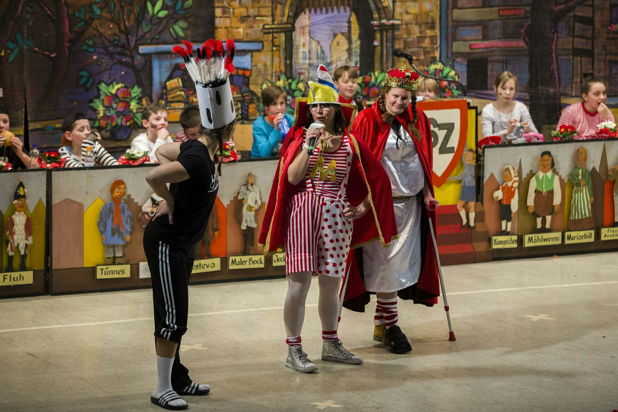 Mit einem sichtlich angeschlagenen Dreigestirn aus den eigenen Reihen ersetzten Prinz (Petra Gebelein), Bauer (Konrektorin Susanne Schückens) und Jungfrau (OGS-Leiterin Pia Junge) das Kölner Kinderdreigestirn, das diesmal aus terminlichen Gründen nicht an der Schulsitzung teilnehmen konnte. Prinz Petra I. kam mit dick verbundenem Zeigefinger (vom vielen Zeigen auf die Tafel), Bauer Susanne hatte Rücken und Jungfrau Pia humpelte auf Krücken über die Bühne.