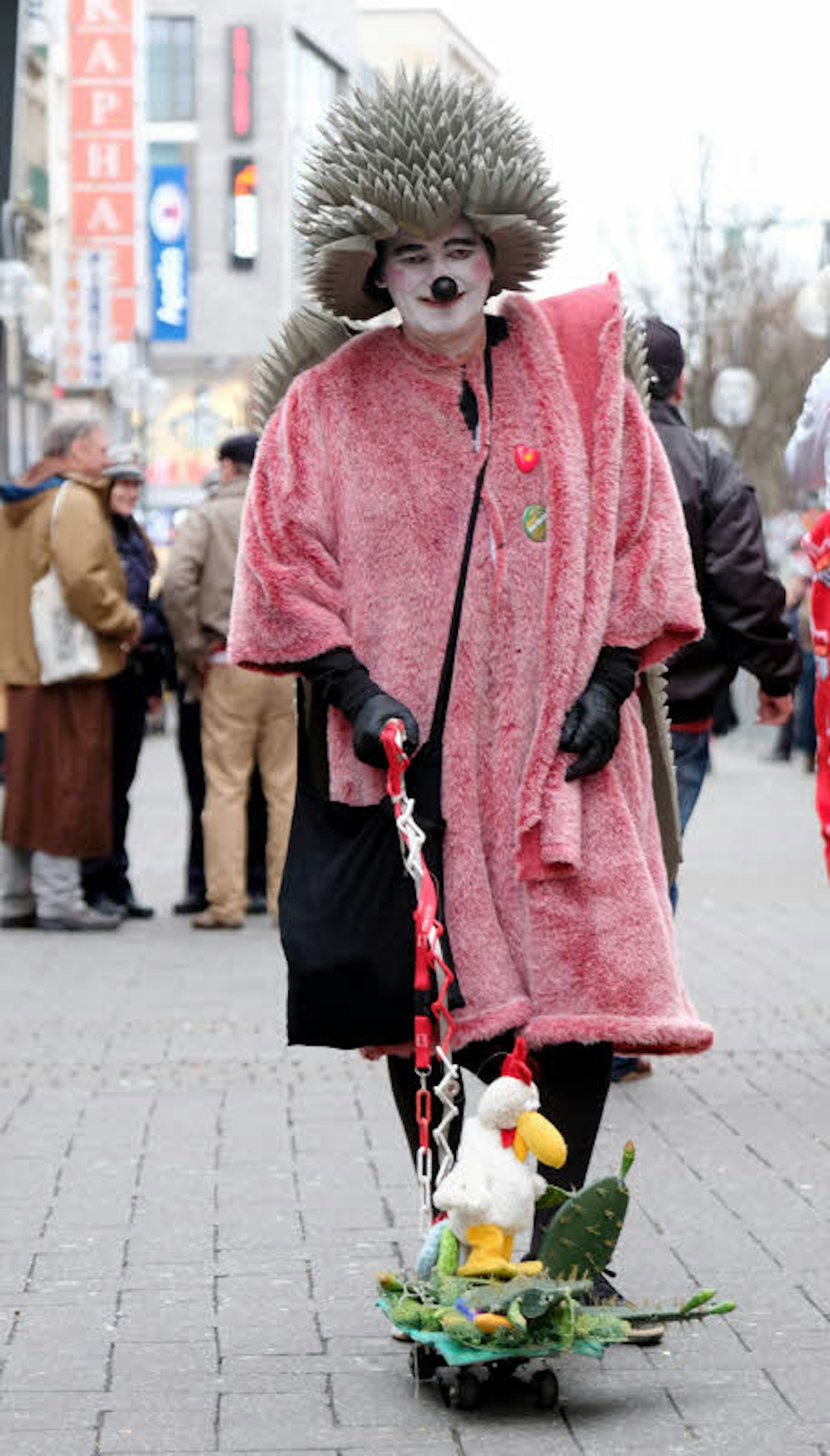 Auch Jean-Pierre Welter gehört zu den Zaungästen des Rosenmontagszugs, die sich normalerweise Jahr für Jahr etwas Neues einfallen lassen. Diesmal gibt er aus der Not heraus den „Igel reloaded“. Sein Partner sei krank geworden. Die großteils aus Dämmmaterial für Tonstudios hergestellte Kostümierung samt der vorwegrollenden Henne im Kakteenbett ist definitiv ein Hingucker, sowohl von hinten als auch von vorne.