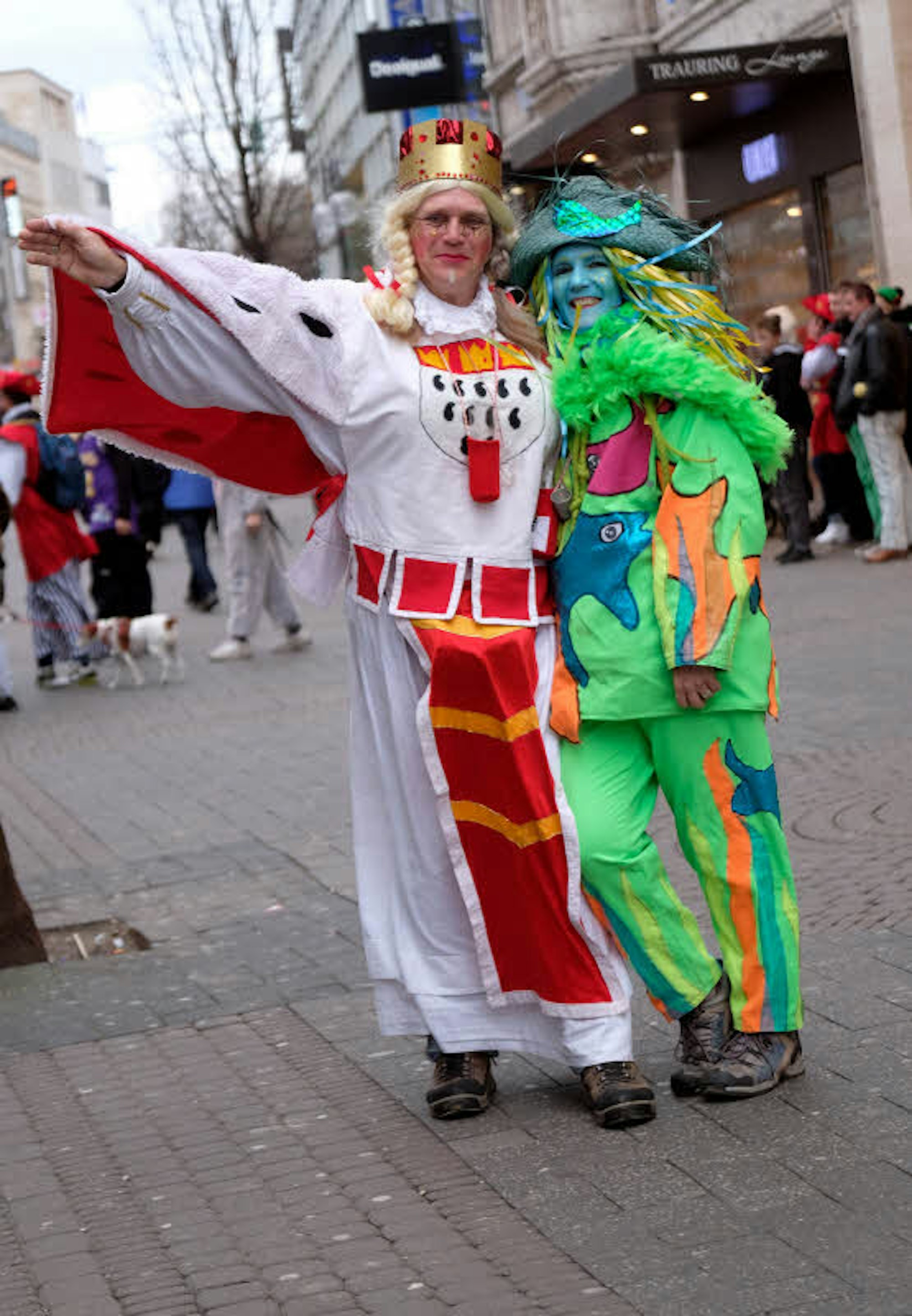 Jungfrau Andreas Blumenthal aus Blumenberg gehört zu denen, die man zuverlässig bei jedem Rosenmontagszug in Neumarktnähe trifft. Seine Frau Eva, eine farbechte Unterwasserpiratin, hat am Morgen lediglich zehn Minuten für die Verwandlung benötigt. „Wir sind ja seit drei Tagen unterwegs und legen uns abends immer schon die Klamotten für den nächsten Tag zurecht. Nur das Unterhöschen ist frisch.“