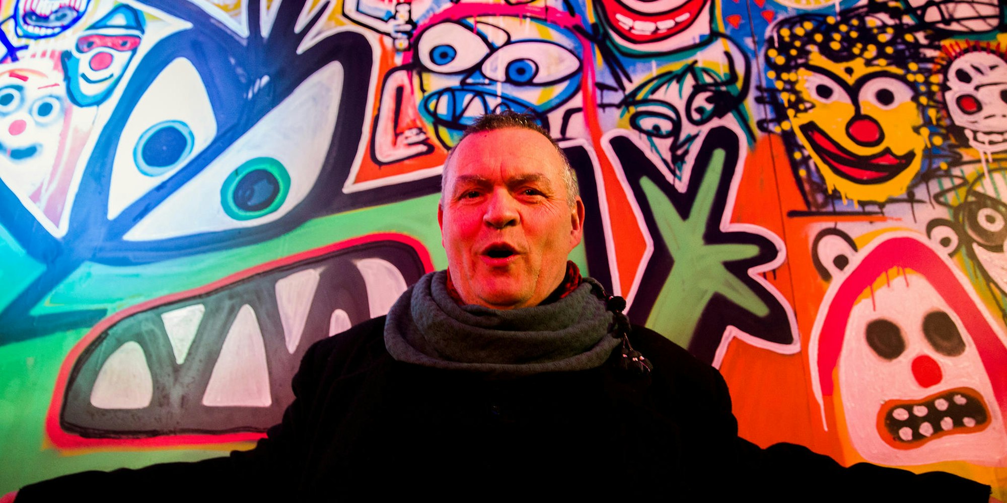 Unter dem Titel „Pappnasenterror“ zeigt der aus der Südstadt stammende Künstler jede Menge „Jecke Köppe“, die in grellbunten Farben dicht gedrängt teils mürrisch, teils aufgebracht, mit schrägen Augen und aufgerissenen Mündern und riesigen Zähnen grinsend auf die Gäste hinabschauen.