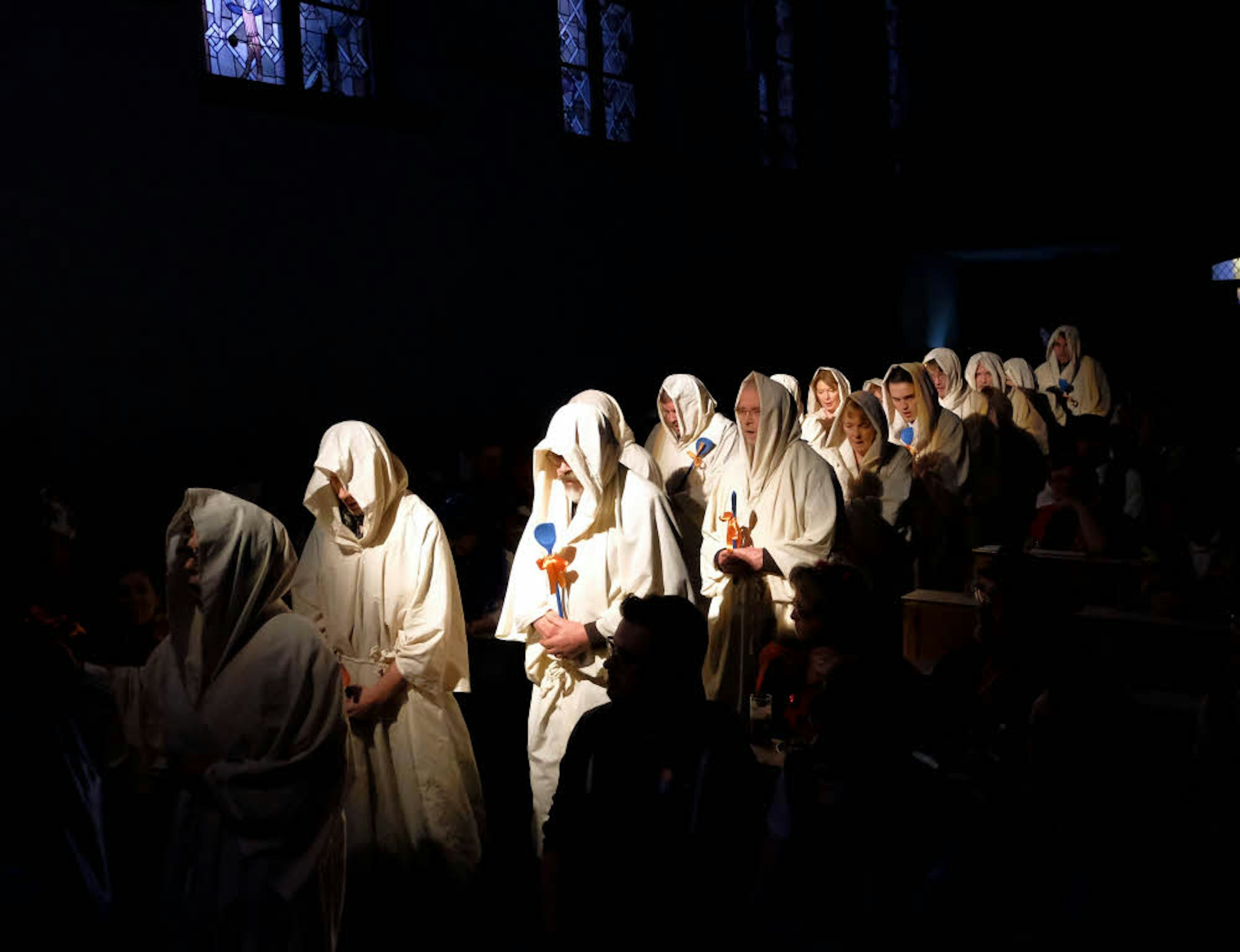 Klatschmarsch gedeckt: Einzug des Ensembles zwischen Kirchenbänken