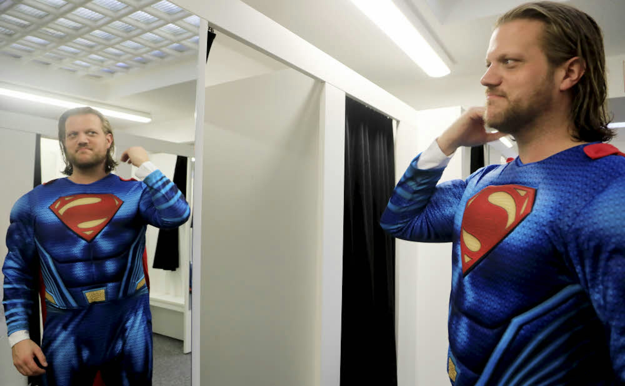 Einige Gänge weiter hat sich Alexander Barth einen grauen Nadelstreifenanzug mit roter Ansteckblume über das Supermankostüm geworfen und begutachtet sich erneut vorm Spiegel und bilanziert: „Damit wird es noch mehr zum Hingucker.“