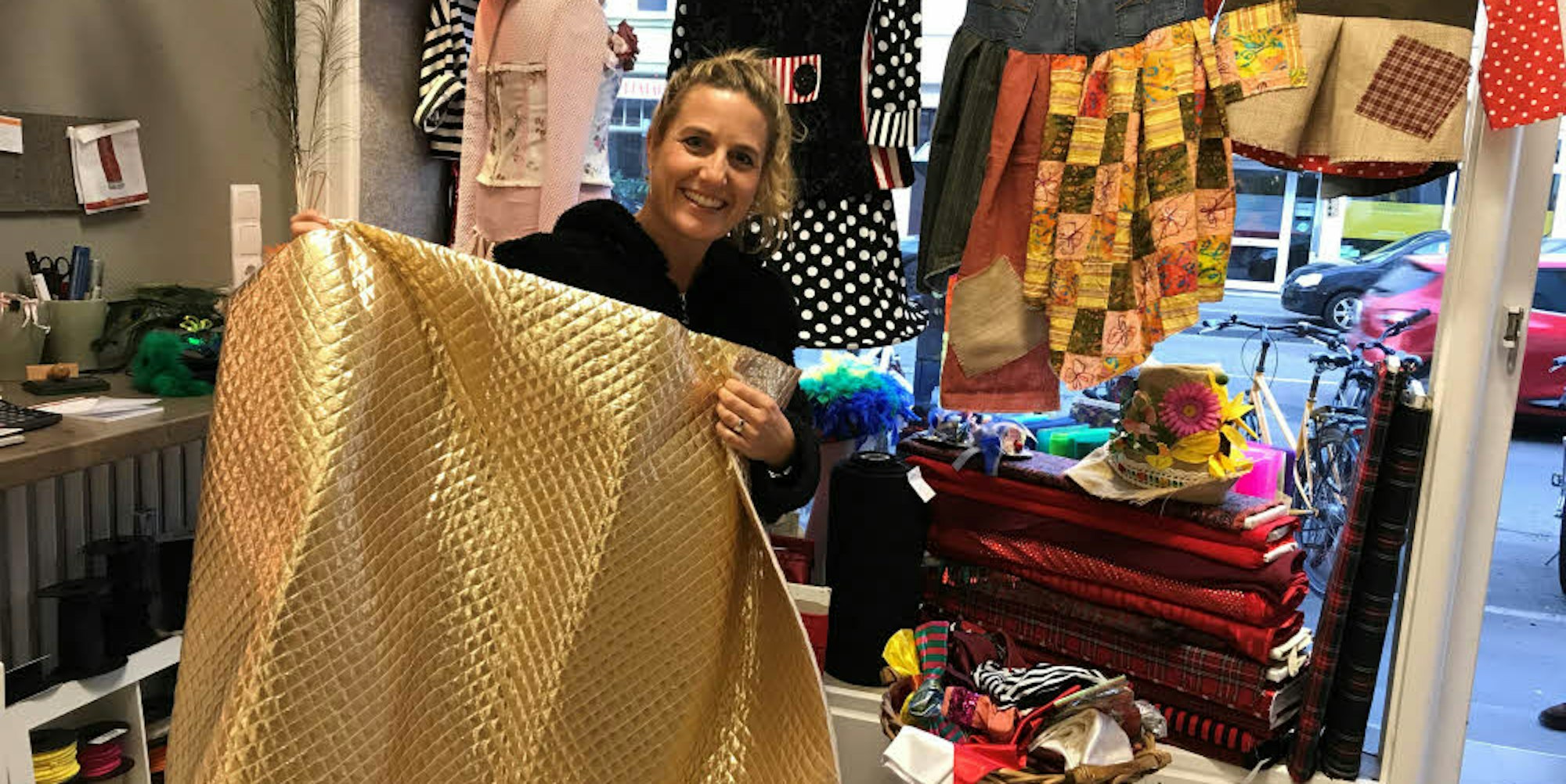Julia Klamp kauft Goldstoff für „Stars und Sternchen“