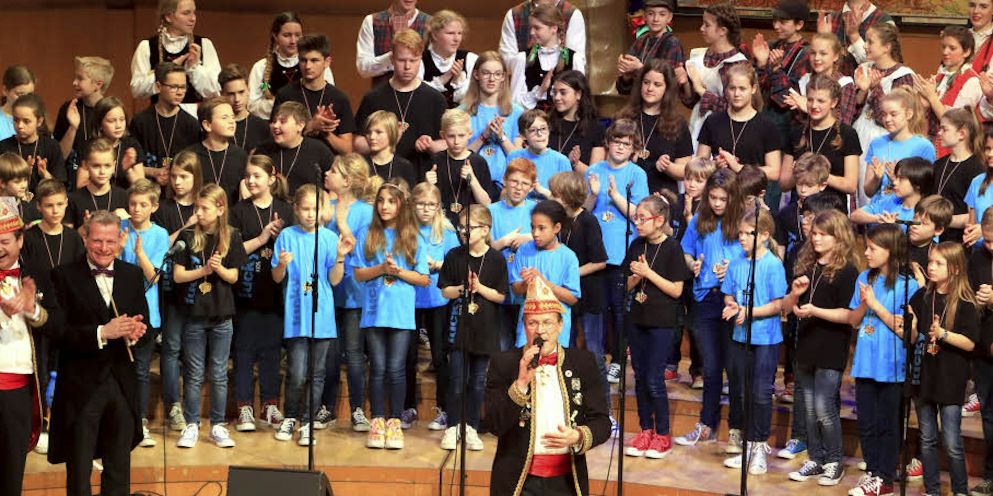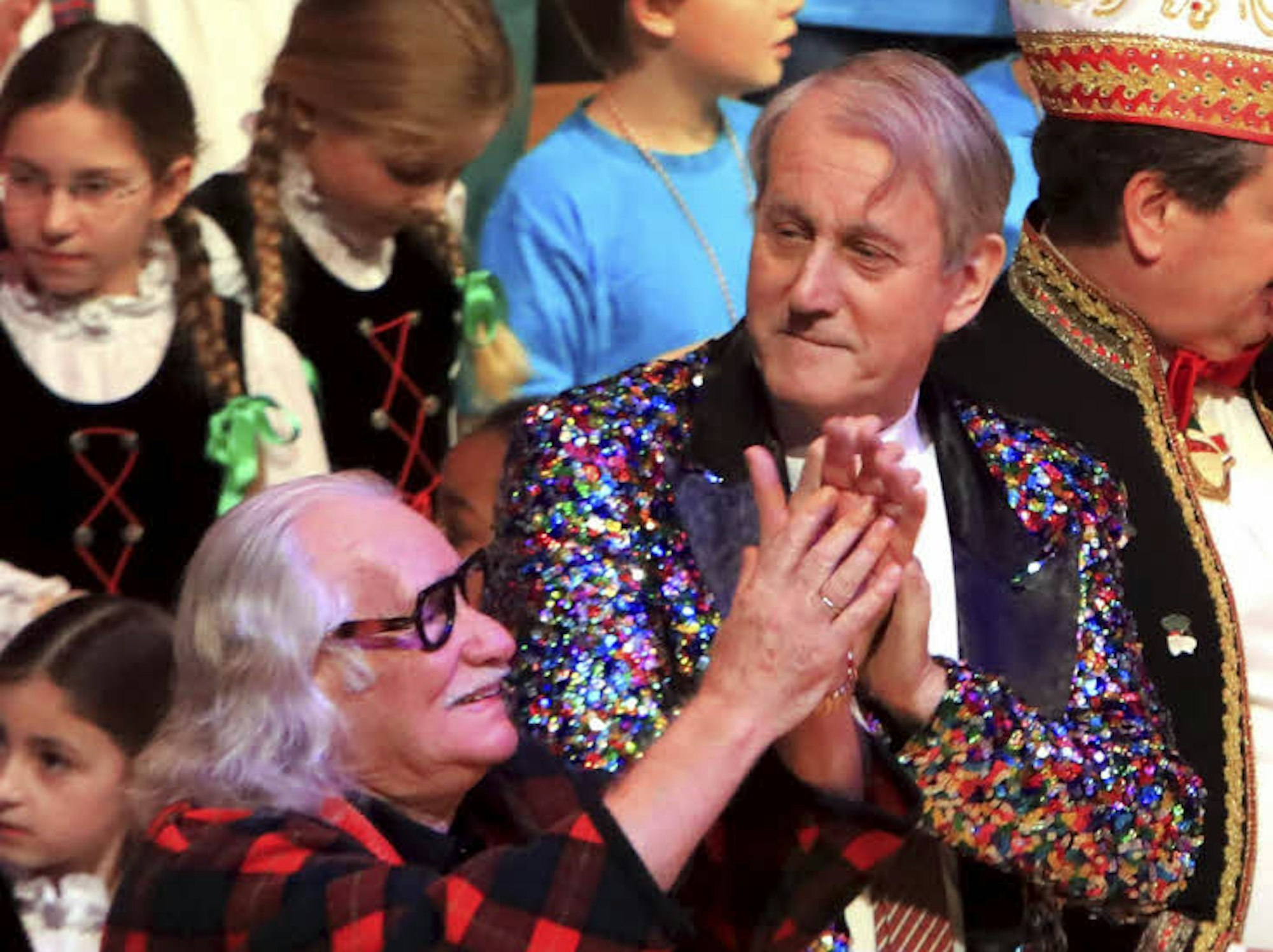 Viel Beifall gab es auch im Fach „Leibesertüchtigung“ für die Jungen und Mädchen der Original Tanzgruppe Kölsch Hännesche und De Pänz us dem ahle Kölle sowie für die Lucky Kids unter der Leitung von Michael Kokott. Einen magischen Moment erlebten die Gäste zum Ende der Matinee. Fast schüchtern betrat Hans Süper den Unterrichtsraum, nahm in der Mitte der Bühne Platz und sang, zunächst nur mit sanfter Begleitung auf seiner Flitsch, „Ich ben ene kölsche Jung“ von Fritz Weber. Später unterstützten die Lucky Kids und das Orchester Markus Quodt den Altmeister des Kölner Karnevals musikalisch. Dazu erhoben sich die Gäste in der Philharmonie und zollten dem „Kölschen Jung“ ihren Respekt.