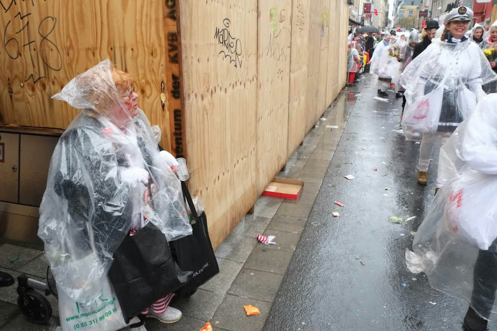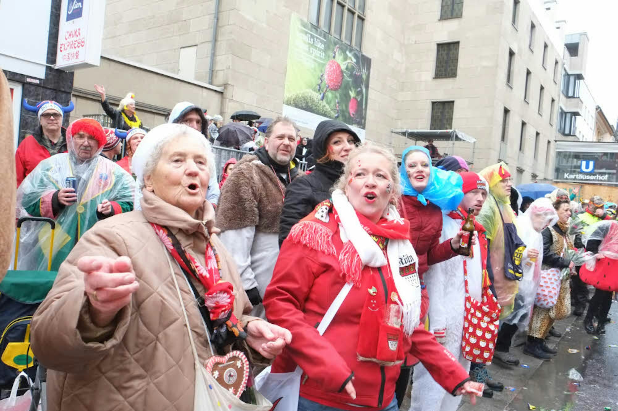 Die Treuen Husaren Blau-Gelb ziehen vorbei, Anne trippelt nach vorn, fragt einen Zugbegleiter: „Macht dir das denn auch Spaß, Junge?“, stupst einen Schnauzbartträger an, der versteht den Wink, bützt sie rechts und links, Anne lobt: „Dat wor ne echt kölsche Jung!“ Als am Mittag gegen 12.30 Uhr Regen einsetzt, hilft die urkölsche Anneliese der urkölschen Anne, ein Einwegcape überzuziehen. Früher sei sie mit den Kölschen Highländern selbst im Zug mitgegangen, noch im vergangenen Jahr „hat mich ein Dudelsack-Spieler im Rollator durch die Torburg geschoben“. Das, sagt Anne, „war ein Höhepunkt meines Lebens“.