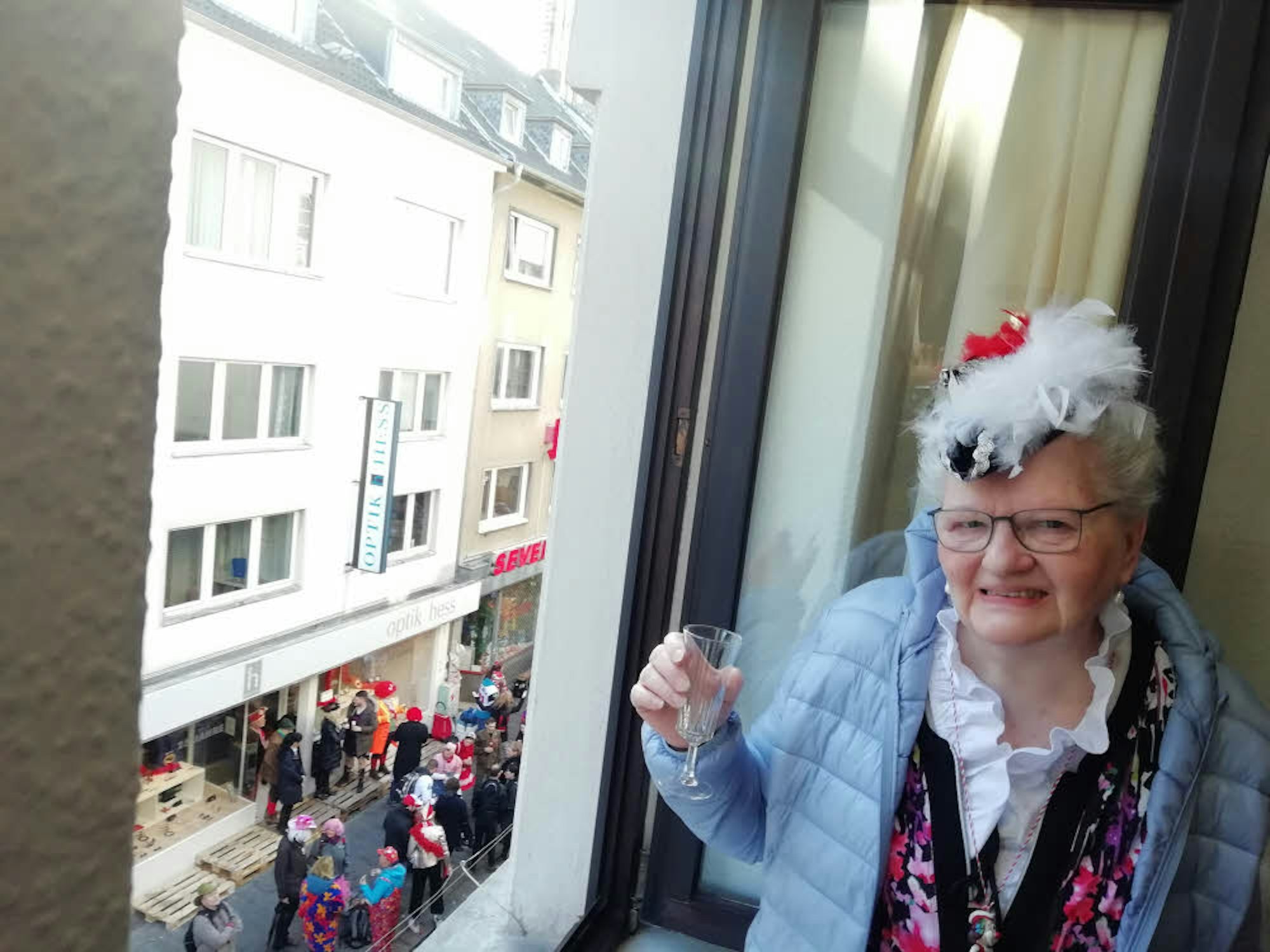 Da geht Barbara Heister, die mit ihrem Sohn Georg schräg gegenüber steht, mit. Im vergangenen Jahr musste die 84-Jährige wegen einer Herz-Operation passen, sonst kommt sie seit 57 Jahren zum Rosenmontagszug in die Südstadt. Vor ein paar Tagen war sie „in der lachenden Sporthalle, oder wie die jetzt heißt“, „der Rosenmontagszug ist aber das A und O“, sagt sie. Da würde Irmgard Floss, die seit 38 Jahren in der Severinstraße lebt und dem Zug von ihrem Fenster im zweiten Stock zuguckt, nicht widersprechen. „Mein Arzt hat gesagt, ich hätte das Herz einer 20-Jährigen“, sagt die 83-Jährige. Rosenmontag kommen jedes Jahr ein paar Freunde und ihre Tochter, um den Zug von einem ihrer exklusiven Logenplätze zu gucken, Floss macht Kartoffelsalat und Brötchen.