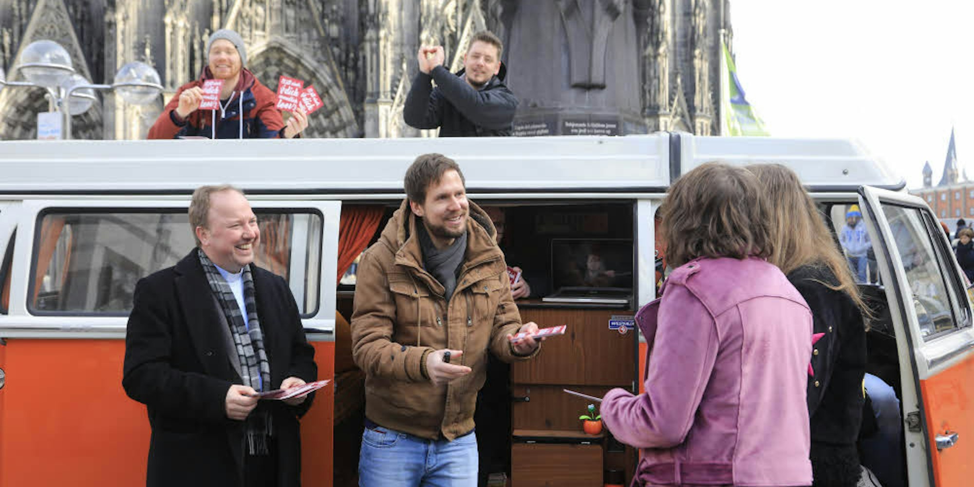 Köln – „Die Idee des Kölner Valentinstages ist es, den Tag neu zu beleben und nicht den Floristen und Drogeristen zu überlassen“, sagte Domdechant Robert Kleine, bevor er mit den Musikern von Miljö auf der Domplatte Postkarten mit dem Aufdruck „Et jitt einer, dä dich unendlich leev hät“ an Passanten verteilte. Es gehe um weniger Kommerz und mehr Sinn, war man sich einig. Die Liebe solle wieder stärker ins Zentrum rücken. Nachdem Brings vor zwei Jahren einen Song zu der Aktion der katholischen Kirche und des Domforums beigesteuert hatten, waren nun Miljö an der Reihe. „Georg Hinz, der sich bei Loss mer singe und auch im Domforum engagiert, hatte angefragt, ob wir nicht ein passendes Lied haben“, so Miljö-Frontmann Mike Kremer. „Ich hatte tatsächlich etwas in der Schublade, das ich dann in einer Nacht fertiggestellt habe.“