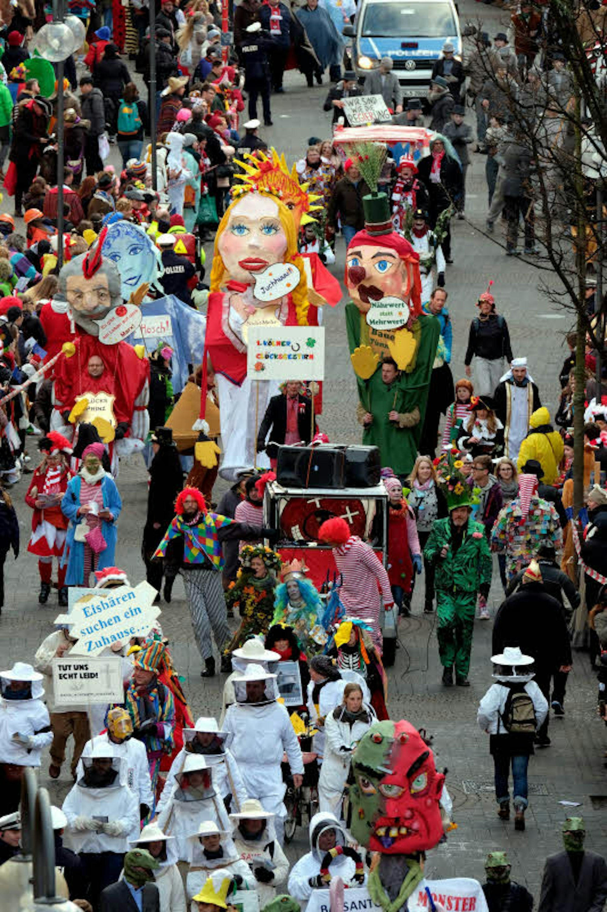 Wie genau der Zug vorm Zug entstanden ist, weiß keiner der Teilnehmer so richtig, auch die Altgedienten nicht. Das sei einfach so gewachsen, sagen sie. Es gibt nur eine minimale Organisation, die da lautet, dass die Gruppen im Abstand von zehn Minuten laufen und wer nach wem folgt. Für dieses Jahr hat sich neben den vier Gruppen, die schon lange mitgehen, auch die Bürgerbewegung „Pulse of Europe“ angemeldet. „Nur zersamme sin mer stark“ ist ihr Motto. Die „Ahl Säu“ sind als „Werbekarawane“ unterwegs, weil Werbung im Zug vom Festkomitee untersagt worden sei.