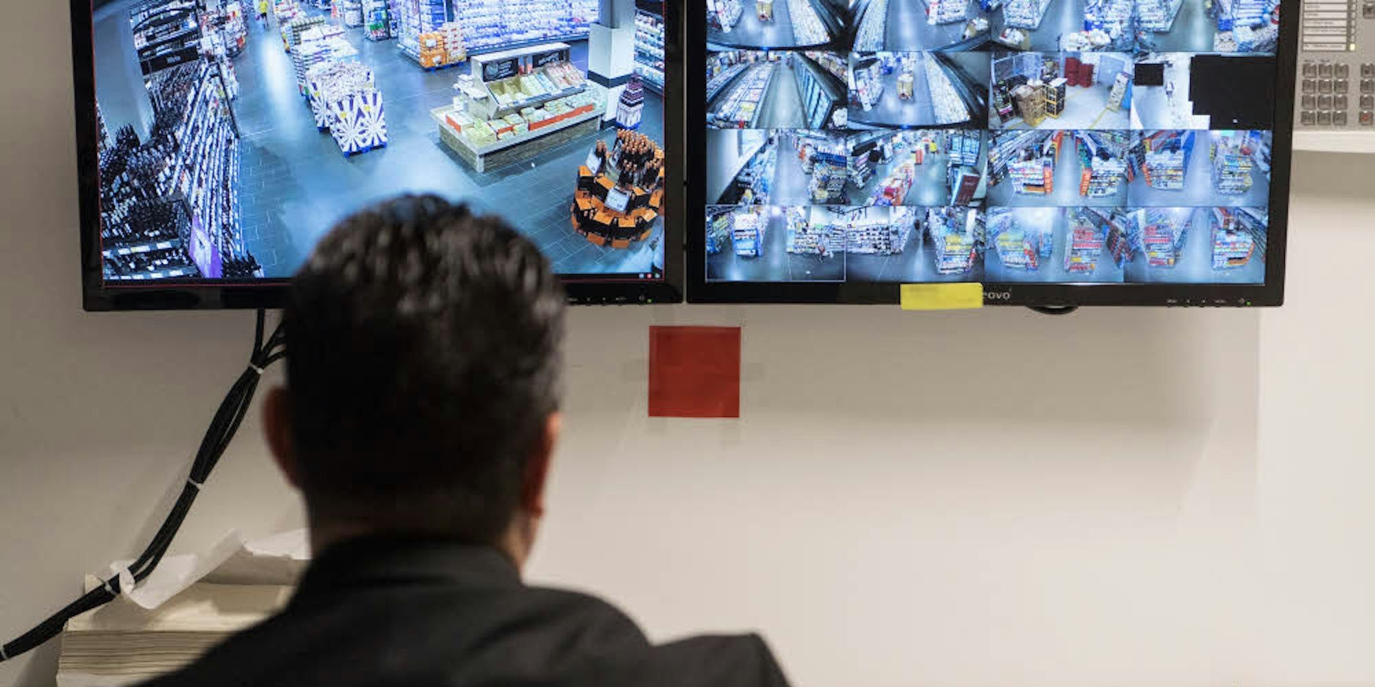Ein Ladendetektiv sitzt vor Überwachungsmonitoren.