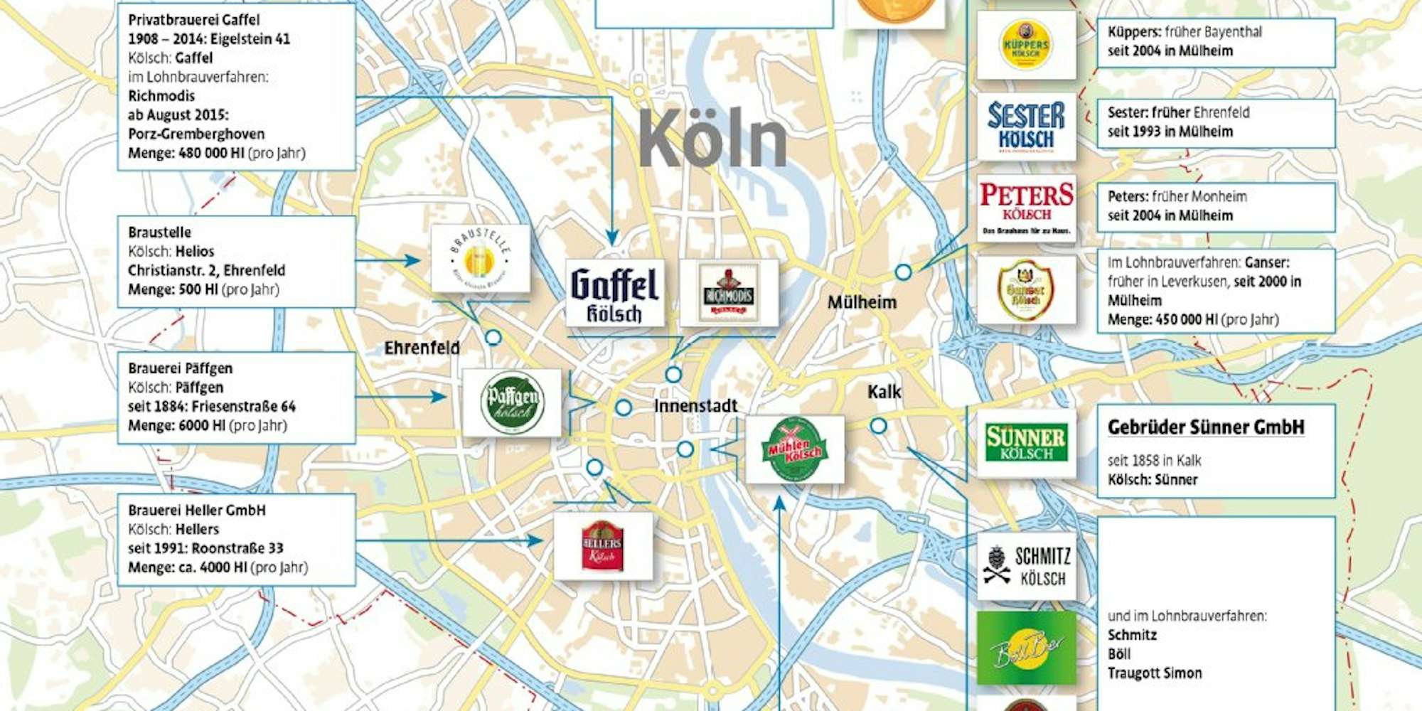Die Produktionsstätte in dem Wohngebiet sei zu klein geworden, erklärte das Unternehmen. Auch Reissdorf, Sion und Früh Kölsch wurden einst in der Innenstadt hergestellt, bevor die Brauereien an den Stadtrand zogen. Wer braut eigentlich noch in der Kölner City? Welcher Konzern steckt hinter den Kölsch-Marken und: wo entsteht welches Kölsch?