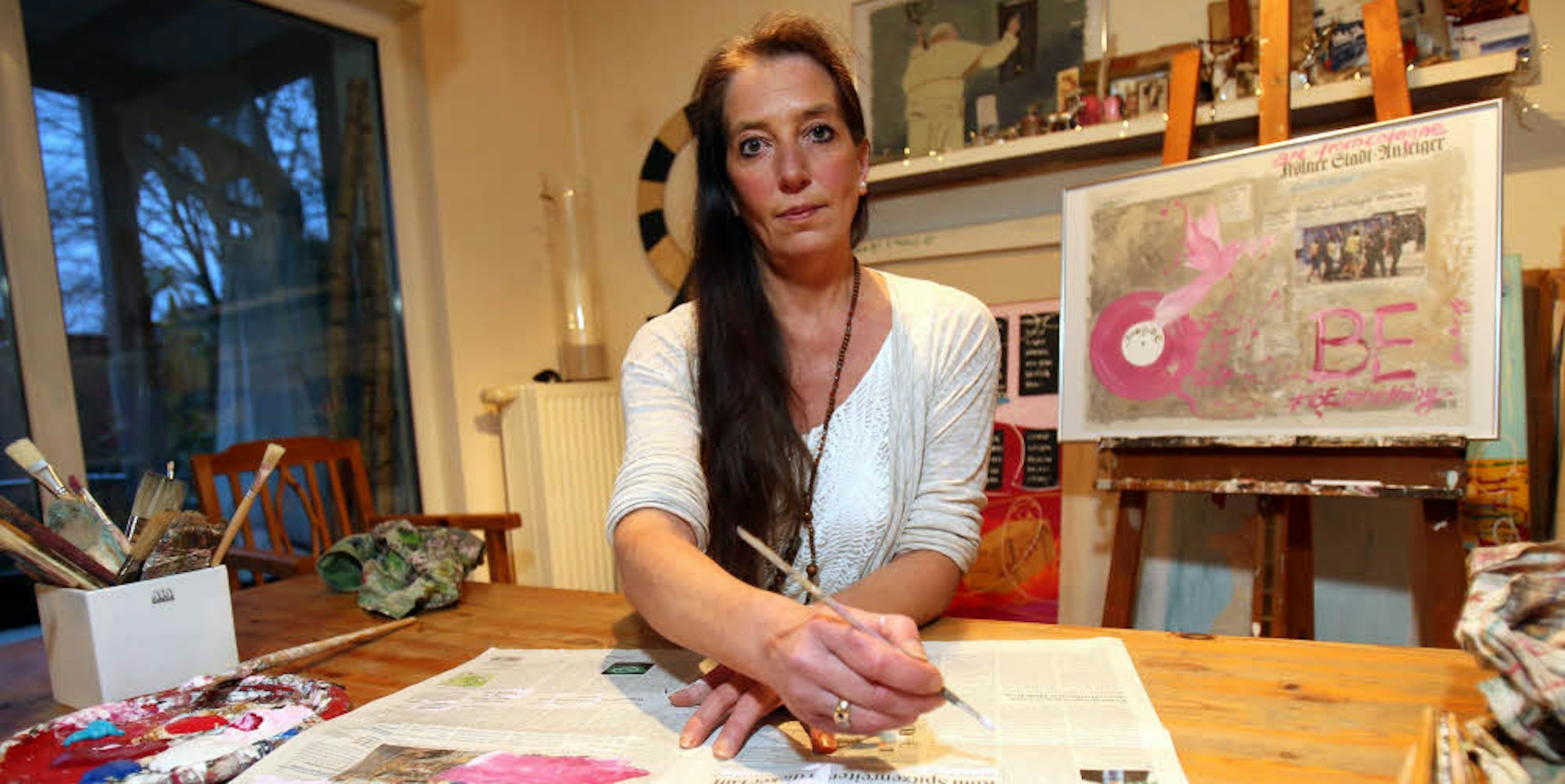Mona Schwenker zeigt Kunst mit „Stadt-Anzeiger“-Ausgaben.
