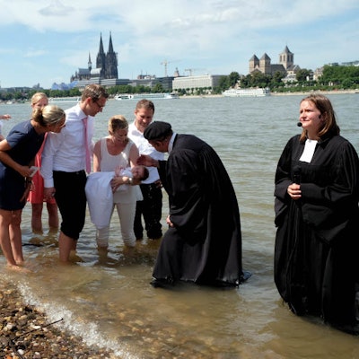 Statt Slipper oder Stöckelschuhe tragen die Eltern Flipflops und Gummistiefel. „Ich freue mich, einen besonderen Ort für unseren Sohn als Taufstätte gewählt zu haben. Der Rhein ist auch viel wärmer als vermutet“, sagt Mutter Susanne, während Tobias im Wasser planscht und vor Freude jauchzt.