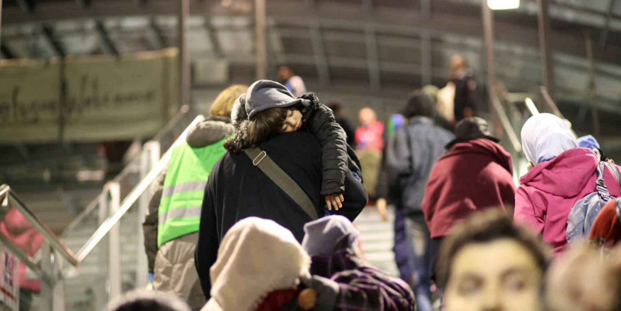 Szene vom Bahnhof: Eine Gruppe kommt nach der Flucht an