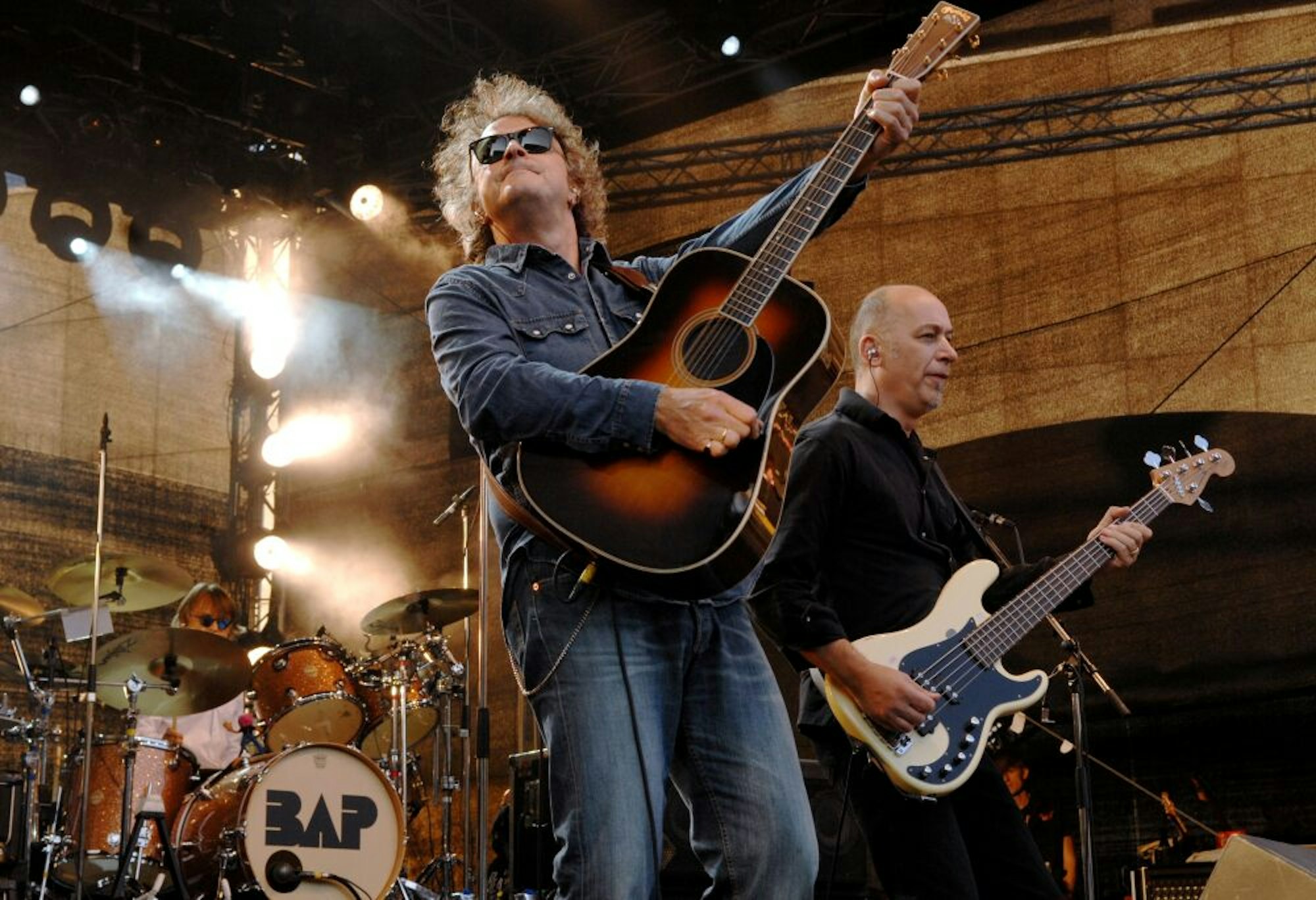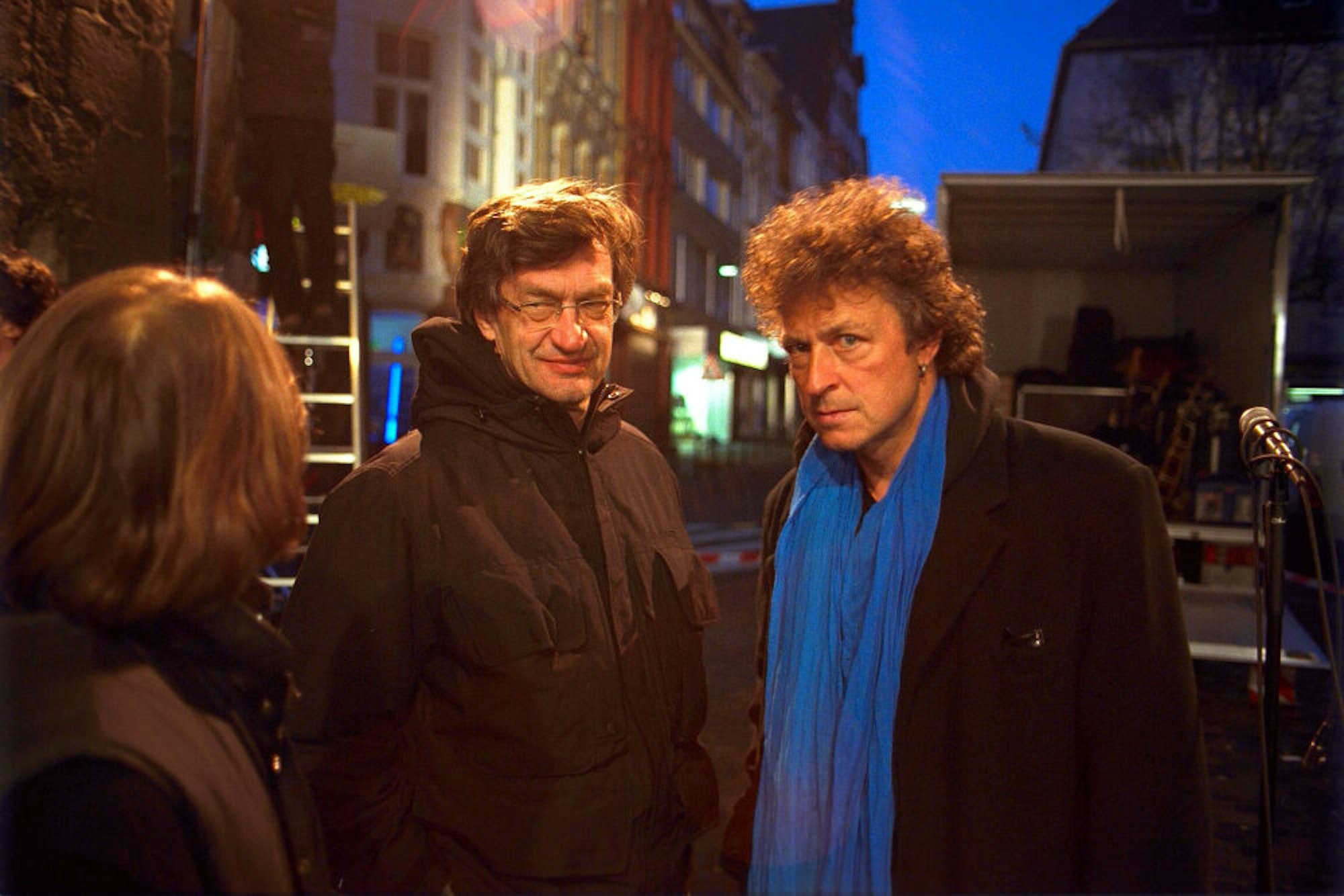 BAP auf dem Roncalliplatz: Wolfgang Niedecken mit Werner Kopal und Jürgen Zöller auf dem Roncalliplatz.