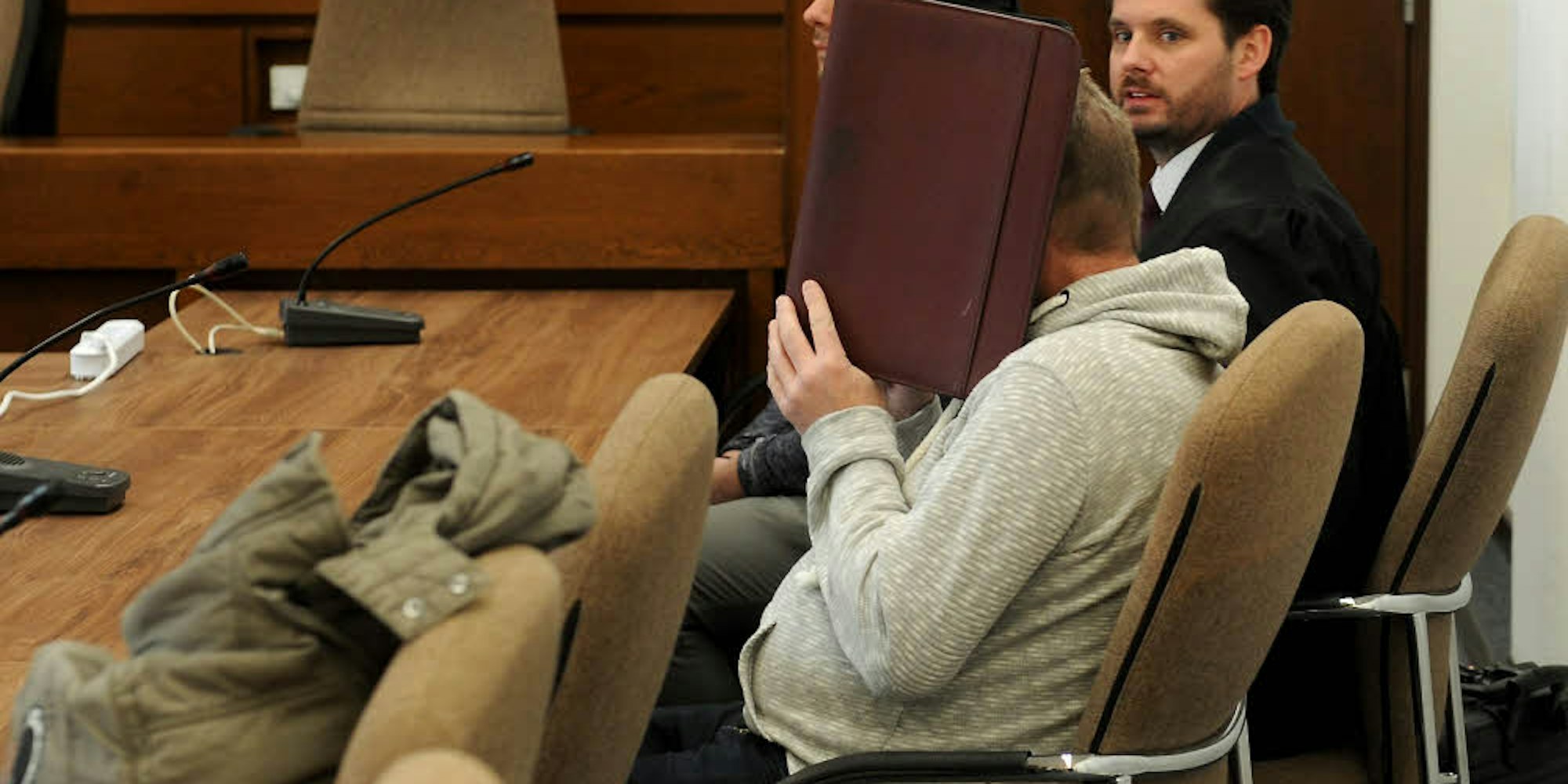 Der Täter im Gerichtssaal hinter einer Mappe (Archivbild)