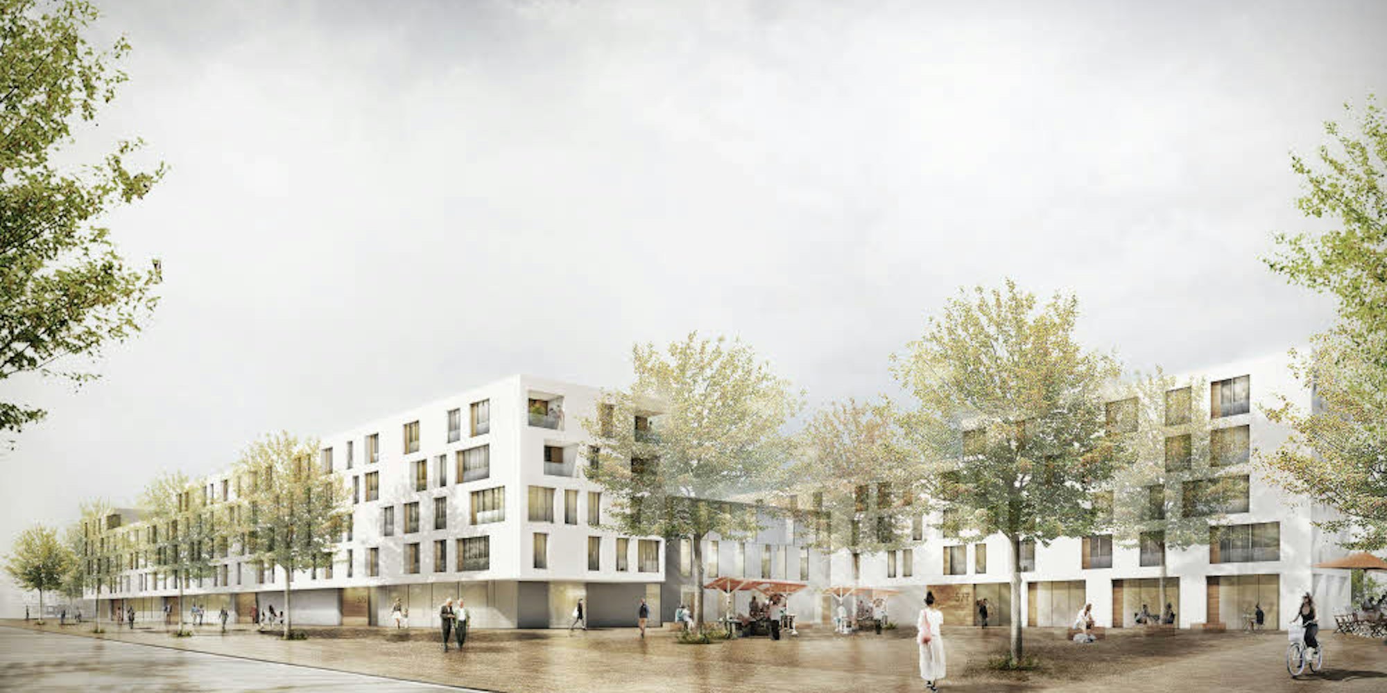 Die Visualisierung zeigt den Blick von der Venloer Straße auf die Neubauten.