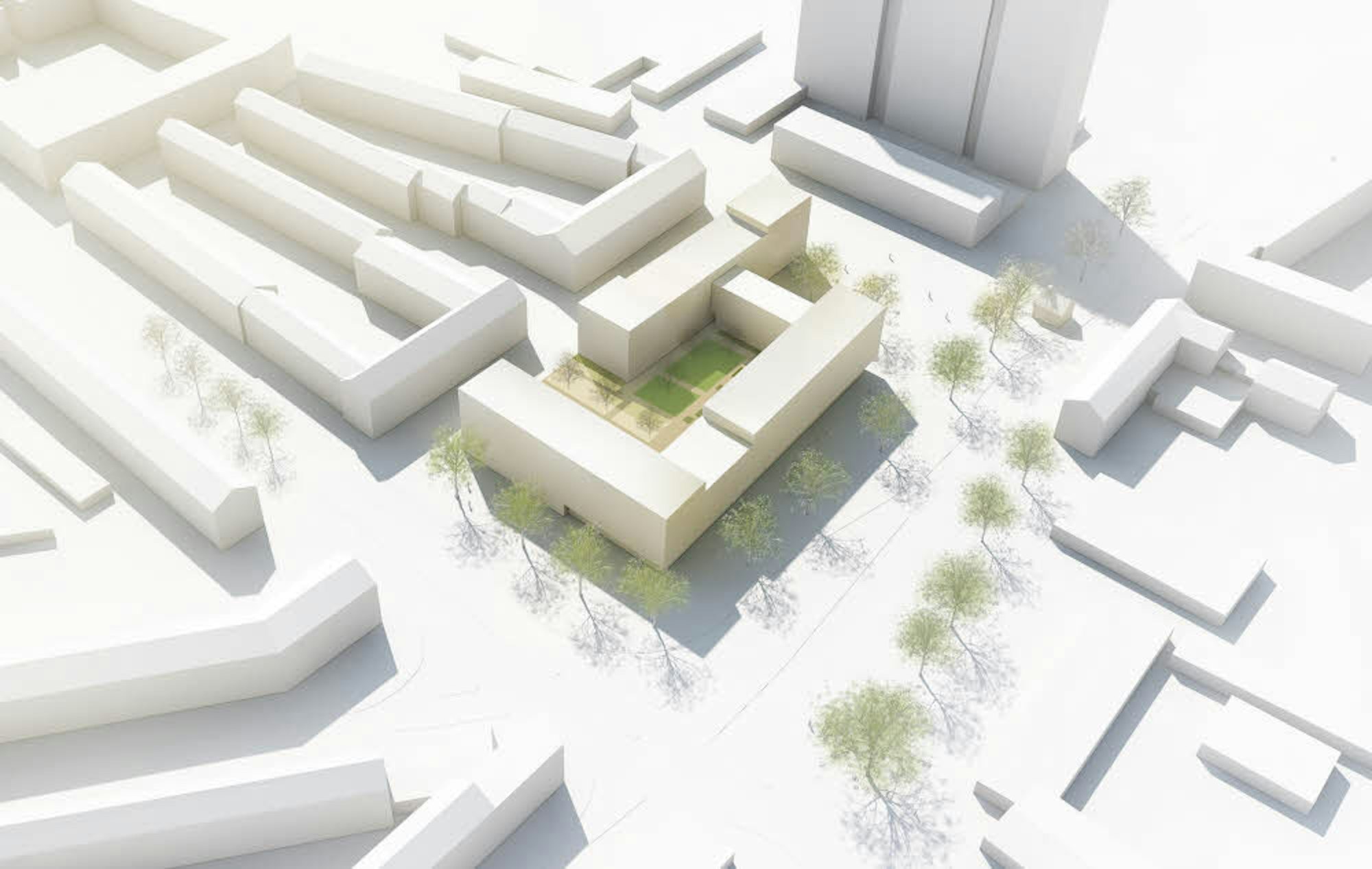 Die vier Gebäuderiegel mit jeweils fünf Etagen bilden einen Block mit einer begrünten Innenfläche. Der Block weist nach Süden eine Öffnung auf. Dadurch wird der Innenbereich für die Öffentlichkeit zugänglich.
