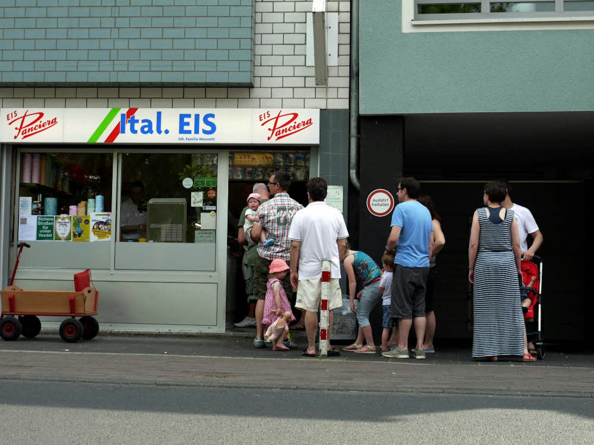 Ein Muss beim Spaziergang durch Brück ist ein Stopp beim italienischen Eiscafé Panciera an der Olpener Straße, vor dem zumeist eine lange Warteschlange steht. Von außen wirkt es eher unscheinbar – ein schmale Tür aus Metall, ein Schaufenster, durch das man vor allem aufgestapelte Papp-Eisbecher sieht. Doch im Inneren bieten Inhaber Franco Moscetti und seine Familie mit einer Auswahl aus 29 selbst gemachten Sorten – die Kugel koste 90 Cent – wohl das beste Eis auf der Schäl Sick.