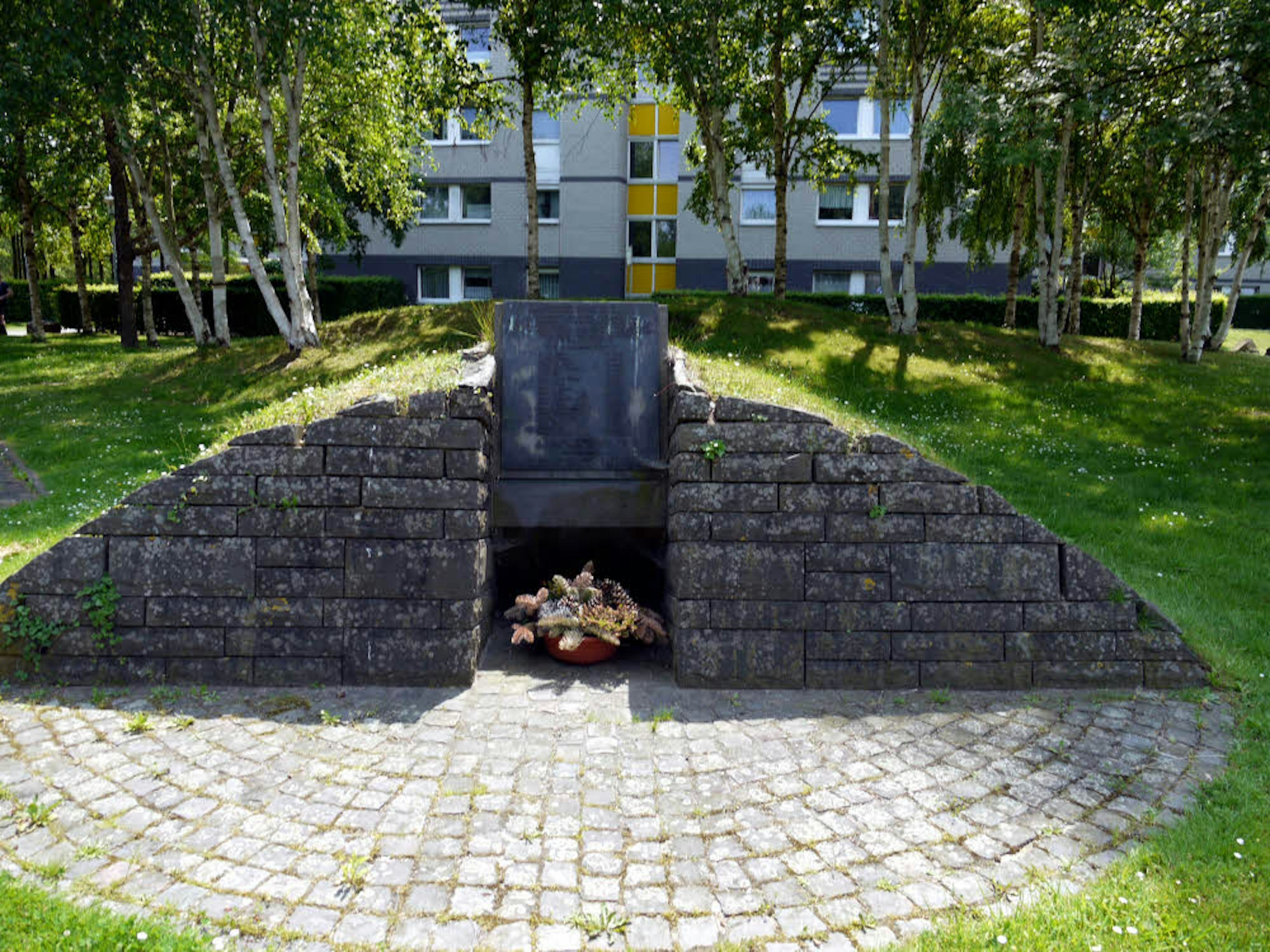 Das Mahnmal an der Kreuzung von Dattenfelder und Hans-Schulten-Straße – errichtet auf Initiative der Brücker Werkstatt für Ortsgeschichte – erinnert an die Ende des Zweiten Weltkrieges dort gefallenen 17 jungen Flak-Helfer. Schüler aus den Ober- und Realschulen gehörten zum letzten Aufgebot, das die Nazis 1945 zur Verteidigung des Militärflughafen „Fliegerhorst Ostheim“ heranzogen.