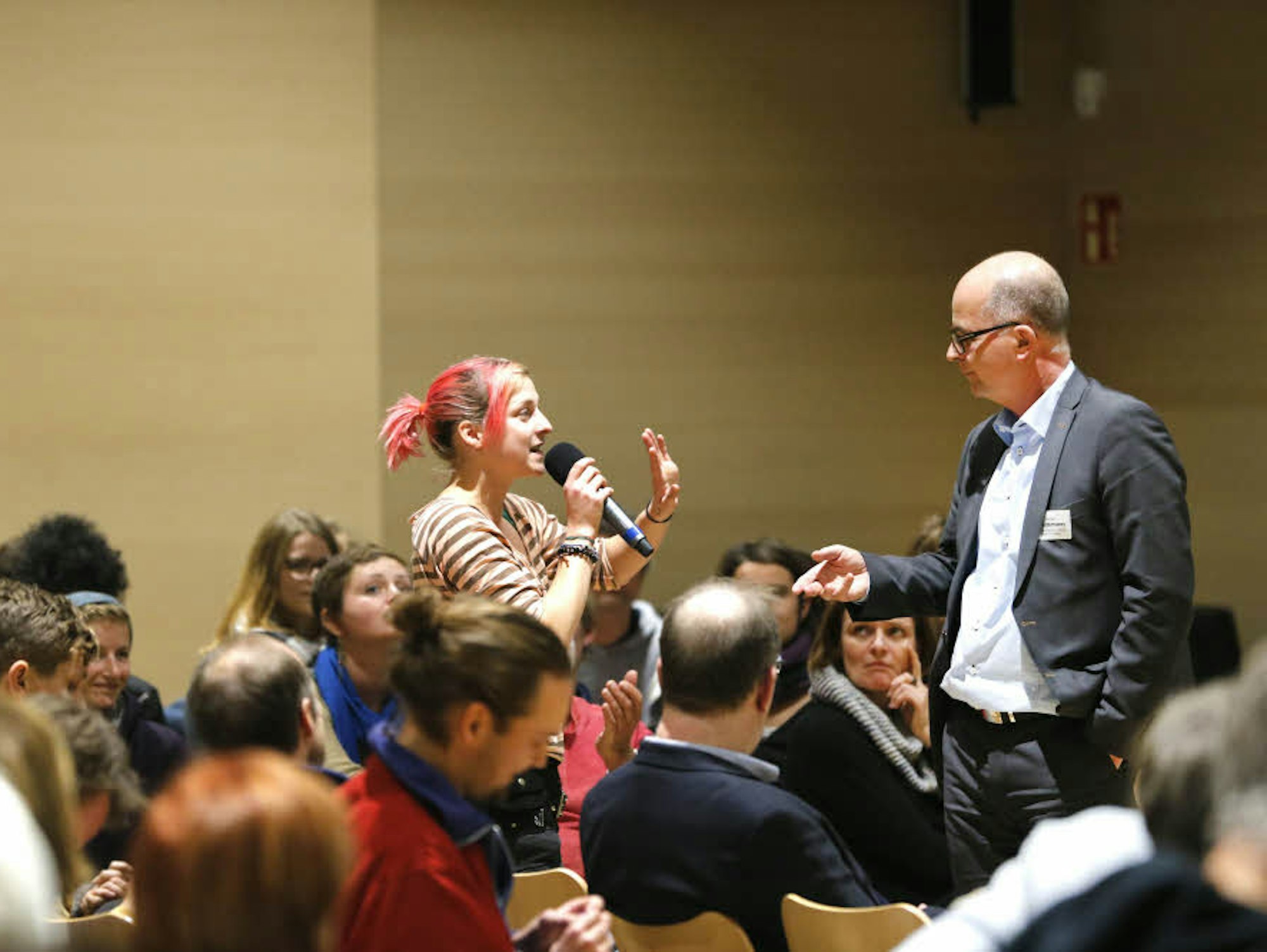 Markus Greitemann diskutiert mit einer AZ-Aktivistin.