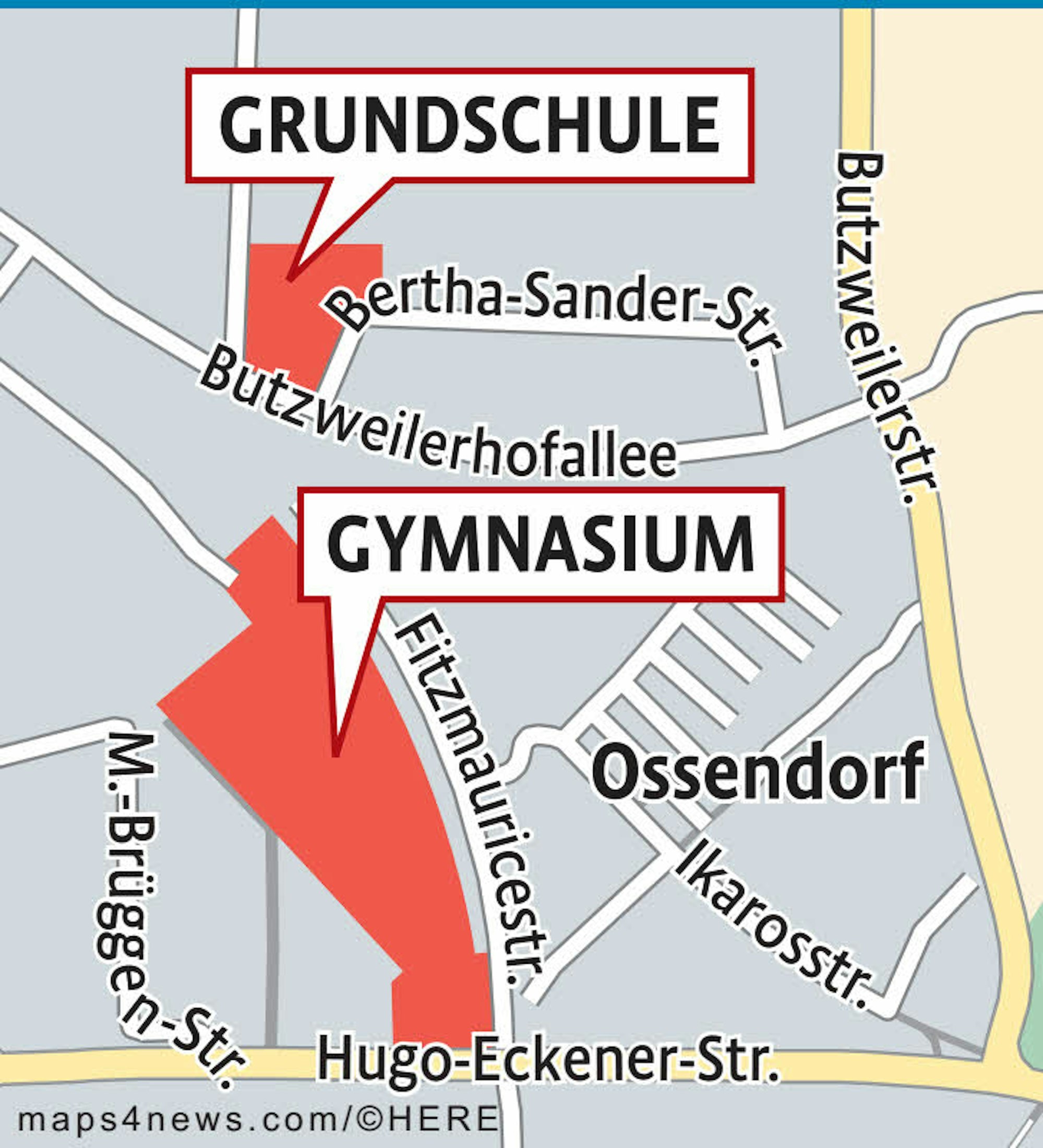 Direkt gegenüber dem historischen Flughafengebäude Butzweilerhof und in der Nähe von Ikea soll an der Fitzmauricestraße ein sechs bis achtzügiges Gymnasium inklusive einer Zweifach- und einer Dreifach-Sporthalle, aber ohne gebundenen Ganztag, gebaut werden. Alternativ wäre auch eine etwas kleinere Variante mit Ganztagsbetrieb denkbar. In unmittelbarer Nähe soll zudem eine zunächst einzügige Nebenstelle der Katholischen Grundschule Wilhelm-Schreiber-Straße entstehen. Diese könnte bei Bedarf auf drei Züge erweitert werden.